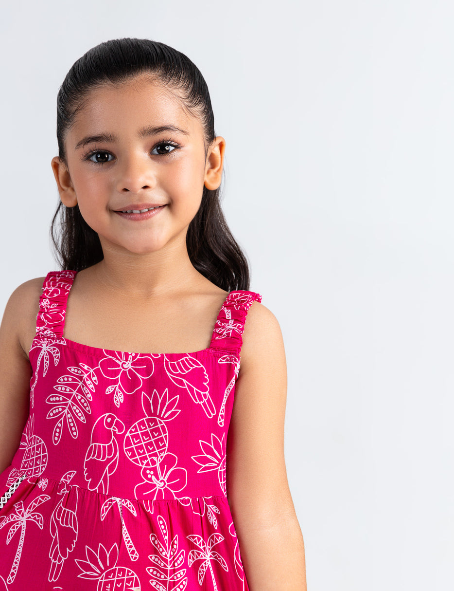 Bring on the summer vibes with this vibrant tropical print sleeveless dress for little girls! Featuring a fun all-over white tropical motif of pineapples, parrots, and palm trees on a bright pink base, this dress is perfect for sunny days, beach outings, or casual playdates. Made from lightweight, breathable fabric, it ensures all-day comfort and features wide shoulder straps and flared hem for a breezy, twirl-friendly fit. A playful must-have for her warm-weather wardrobe!