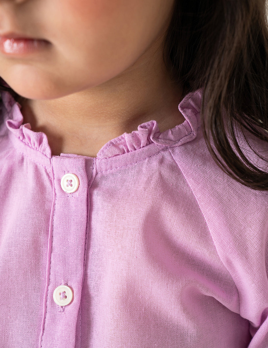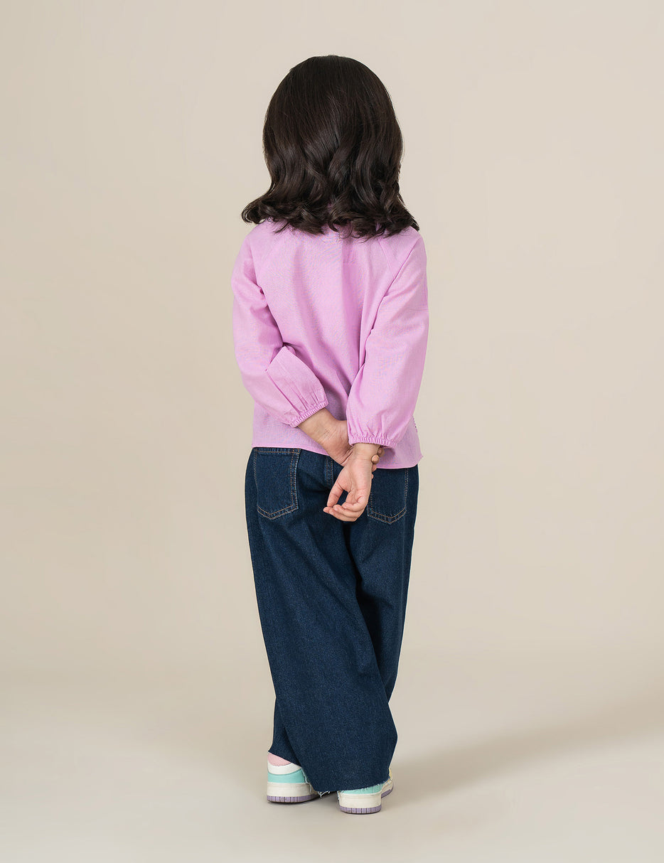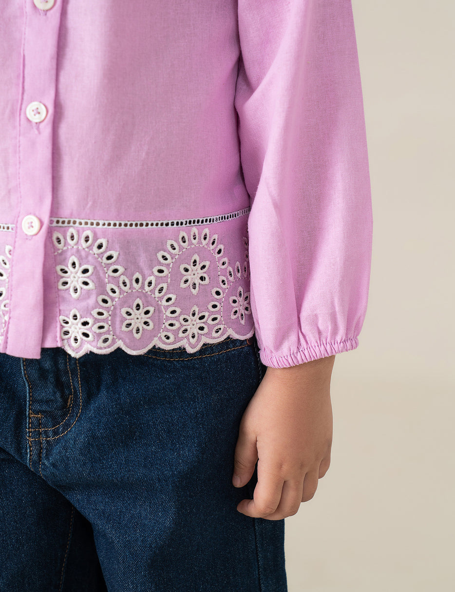 This charming pink top for little girls is perfect for any casual or special occasion. Crafted from soft, breathable cotton, it features delicate white floral lace embroidery along the hem for a sweet, feminine touch. The top includes full sleeves with elastic cuffs, button-down front, and a ruffled neckline that adds a dash of cuteness. Comfortable and stylish, it’s ideal for pairing with jeans, leggings, or skirts for an effortlessly pretty look.