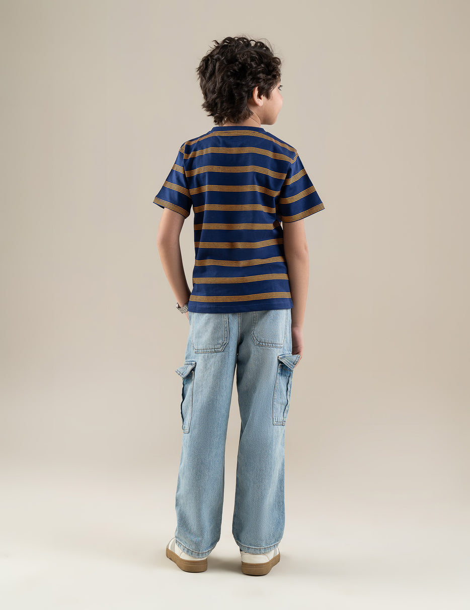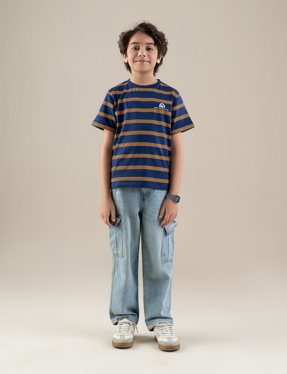 Smart, sporty, and perfect for everyday wear, this striped short sleeve T-shirt for boys is a wardrobe essential. Designed in a classic blue base with contrasting horizontal stripes, it offers a stylish yet casual look. Made from soft, breathable fabric, it ensures all-day comfort whether he’s at school, playing outdoors, or relaxing at home. The crew neckline and regular fit provide easy movement, while the durable stitching makes it ideal for active boys. Pair it with jeans, shorts, or joggers for a cool and effortless outfit.