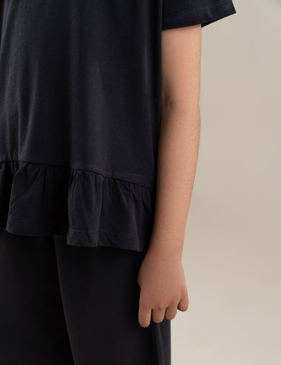 Keep her style comfy and cute with this trendy 2 Piece “Take A Rest” Graphic Suit for Girls. Featuring a stylish black short-sleeve top with a sweet floral graphic and “Take A Rest” print, this outfit adds a fun and relaxed vibe to her wardrobe. The top is designed with a charming frill hem for an extra touch of flair, paired with matching wide-leg trousers for a modern and comfortable look. The elastic waistband ensures a perfect fit, while the soft fabric keeps her comfortable all day long. Perfect for casual outings, playdates, or everyday wear — a chic and comfy set she’ll love!