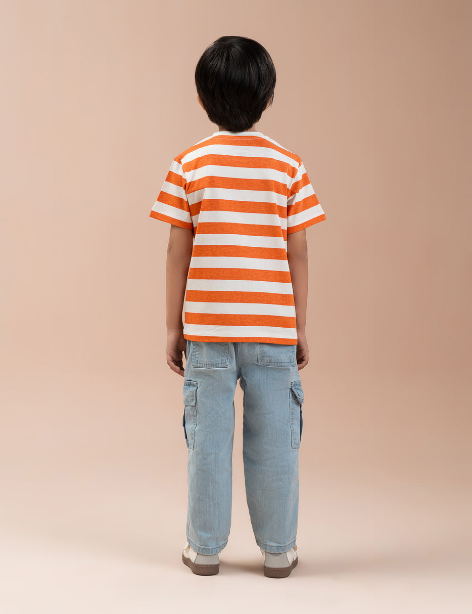 Brighten up his everyday style with this adorable Striped Graphic T-Shirt for Little Boys. Designed with bold orange and cream horizontal stripes, this tee features a cute tiger graphic on the front that adds a fun and playful touch. Made from soft, breathable fabric, it ensures all-day comfort for active little ones. Perfect for playtime, casual outings, or summer days, this stylish t-shirt pairs easily with shorts or jeans for a cool and comfy look.