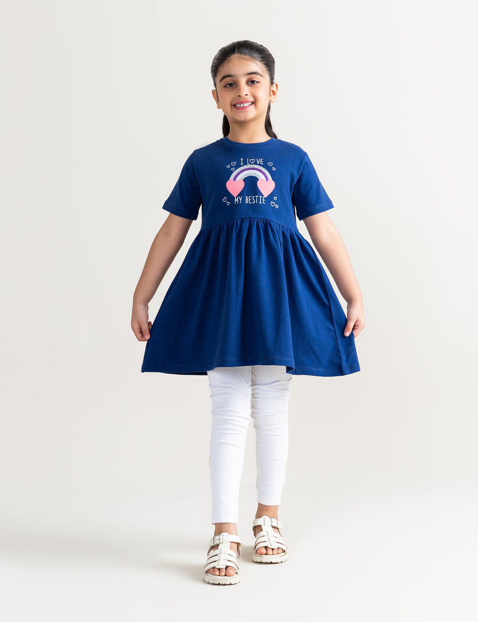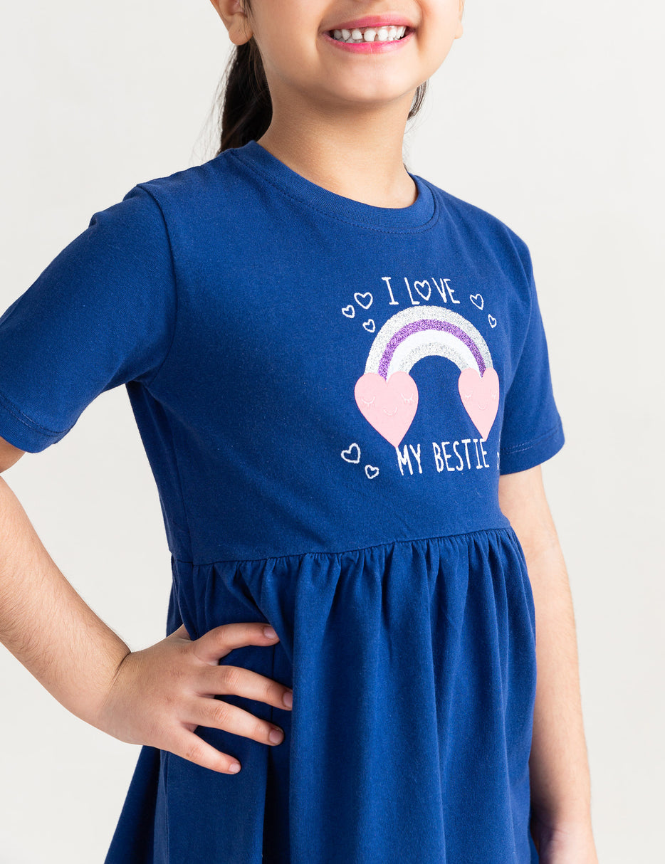 This adorable “I Love My Bestie” Printed Dress for Little Girls is the perfect mix of comfort and cuteness. Designed in a rich navy blue shade, it features a playful rainbow and heart print that celebrates friendship in style. Made from soft, breathable fabric, this short-sleeved dress is ideal for playdates, casual outings, or everyday wear. A cheerful must-have for her little wardrobe!