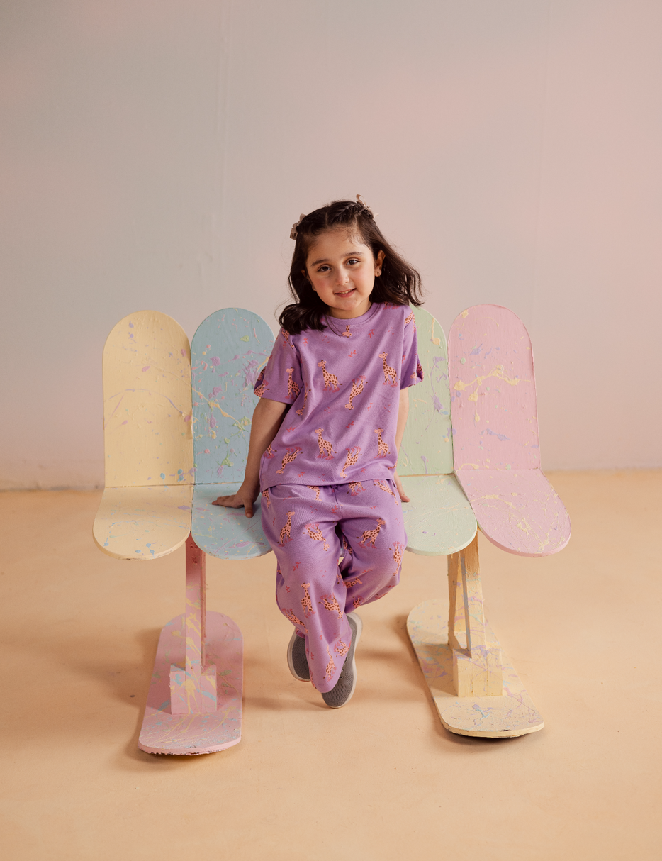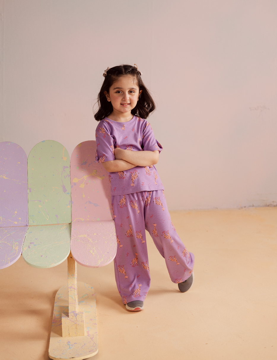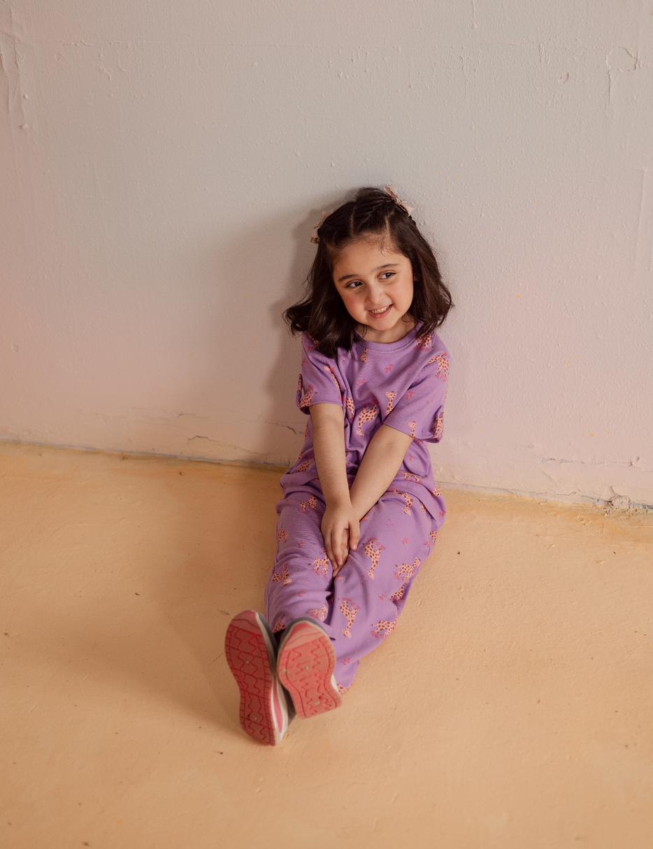 Brighten up her wardrobe with this adorable 2-piece giraffe print suit for little girls. The set includes a short-sleeve top and matching trousers in a soft purple shade, decorated with playful giraffe prints all over. Made from lightweight and breathable fabric, this outfit is perfect for casual wear, playdates, or everyday comfort while keeping her stylish and happy.