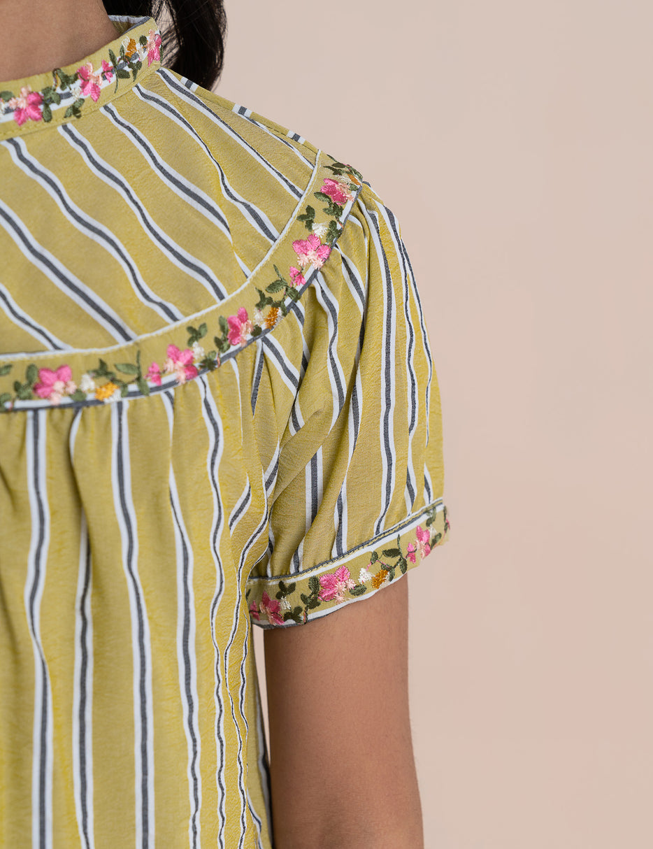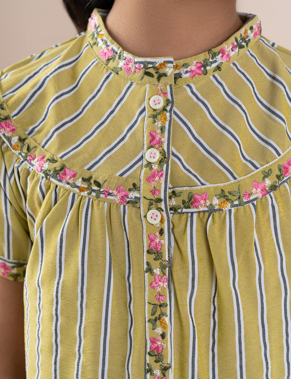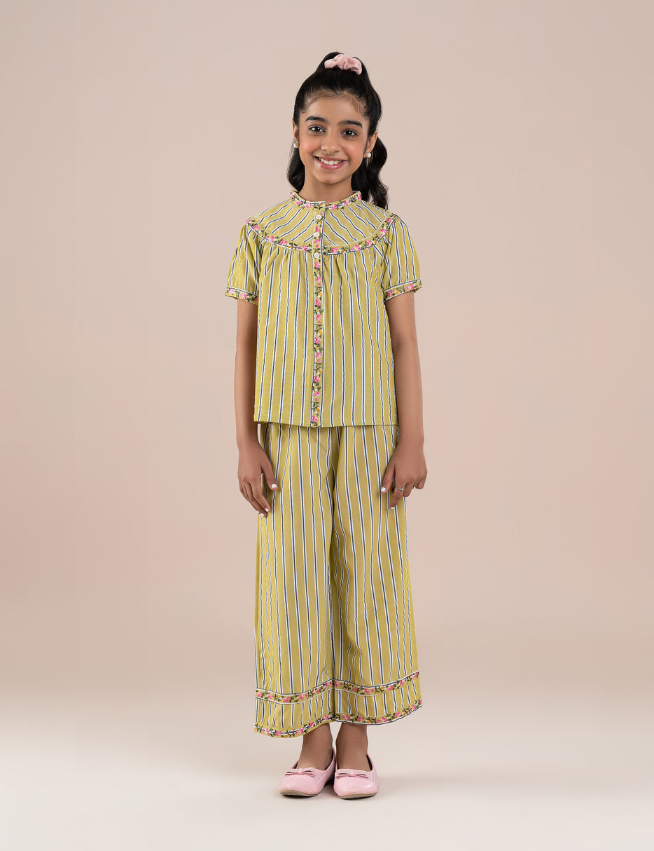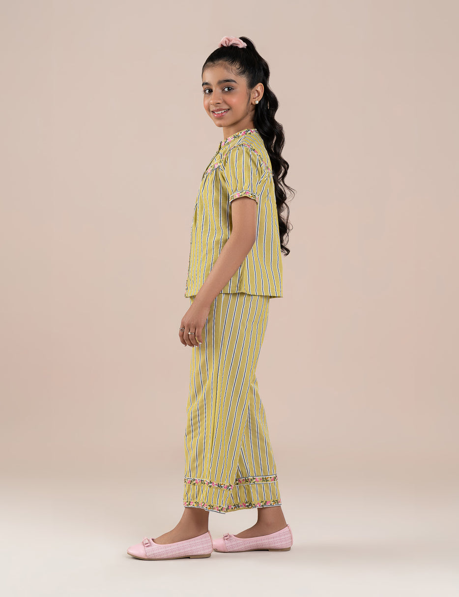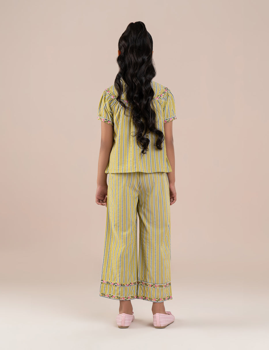 This stylish 2-piece outfit for girls features a coordinated striped top and matching pants, designed for both comfort and charm. The short-sleeve top comes with a round neckline and delicate floral trim along the front, adding a soft, feminine touch. The matching pants feature an elastic waistband with a drawstring for an easy, comfortable fit and are finished with floral detailing at the hems. Made from lightweight, breathable fabric, this set is perfect for casual wear, outings, or relaxed gatherings, offering a trendy yet comfortable look for everyday style.