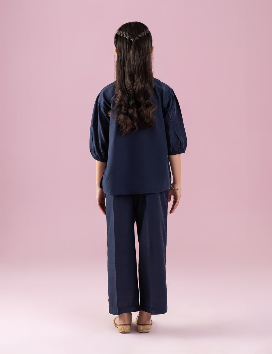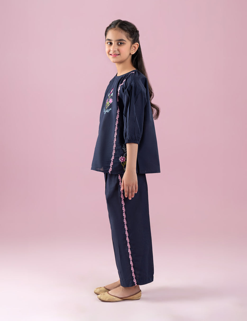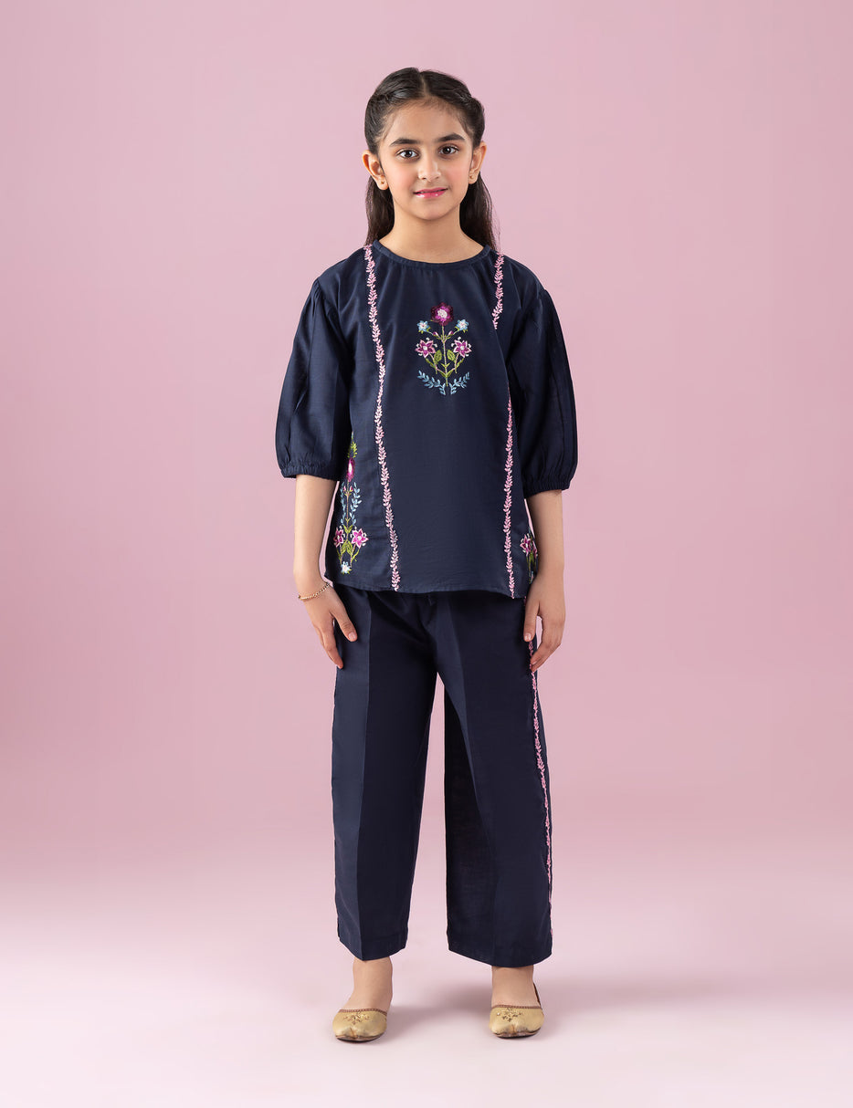 Add a touch of elegance to her wardrobe with this beautiful 2 Piece Floral Embroidered Suit for Girls. Designed in a rich navy blue shade, this charming outfit features delicate floral embroidery on the shirt, enhanced with vertical embroidered detailing for a graceful look. The soft puff sleeves add a stylish finish, making it perfect for festive and semi-formal occasions. The matching trousers complete the look with coordinated embroidered accents, creating a polished and trendy outfit. Comfortable, breathable, and easy to wear, this suit is ideal for family gatherings, celebrations, and special outings.