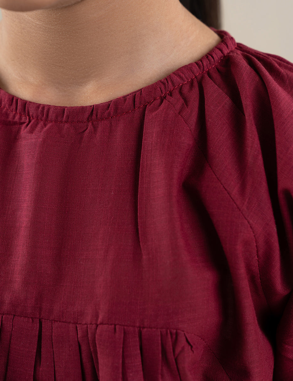 Add a traditional touch to her wardrobe with this elegant 2 Piece Embroidered Peplum Suit for Girls. Designed in a rich maroon shade, the peplum-style top features delicate all-over embroidery and fine detailing on the hem for a graceful look. The matching straight trousers are beautifully coordinated with embroidered motifs and neat border finishing, creating a perfectly balanced outfit. Made from soft and comfortable fabric, this suit is ideal for festive occasions, family gatherings, and special events. Stylish, comfortable, and full of charm — a perfect ethnic outfit for your little girl!
