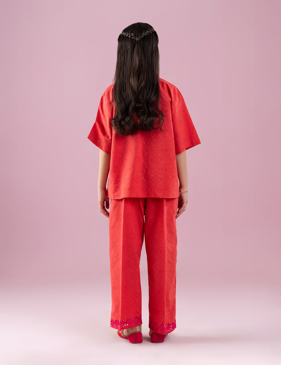 Brighten up your little girl’s wardrobe with this elegant orange 2-piece outfit. The set features a stylish long-sleeve button-down shirt with a smart collar and beautiful pink floral embroidery along the hem, adding a vibrant and graceful touch. The matching pants are designed with a comfortable fit and coordinated embroidered detailing at the bottom for a complete, polished look. Made from soft and breathable fabric, this outfit ensures comfort while keeping her stylish for family gatherings, festive occasions, or casual outings. A perfect blend of tradition and modern charm, this embroidered set is a lovely addition to any girl’s collection.