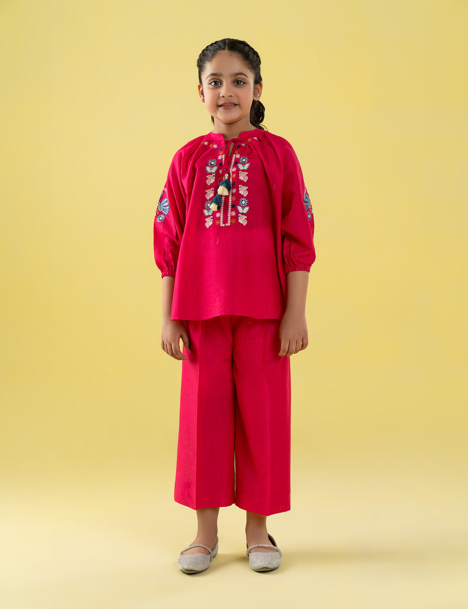 Add a touch of elegance to her wardrobe with this beautiful embroidered kurta and trouser set for girls. The set features a richly colored kurta adorned with delicate floral and bird embroidery on the front and sleeves, enhanced with stylish tassel detailing at the neckline. Paired with matching straight-fit trousers, this outfit is crafted from soft, breathable fabric to ensure all-day comfort. Perfect for festive occasions, family gatherings, or special outings, this charming ethnic set blends traditional design with modern comfort for a graceful look.