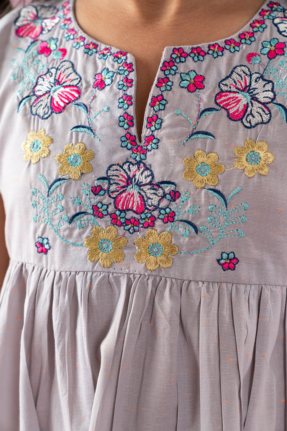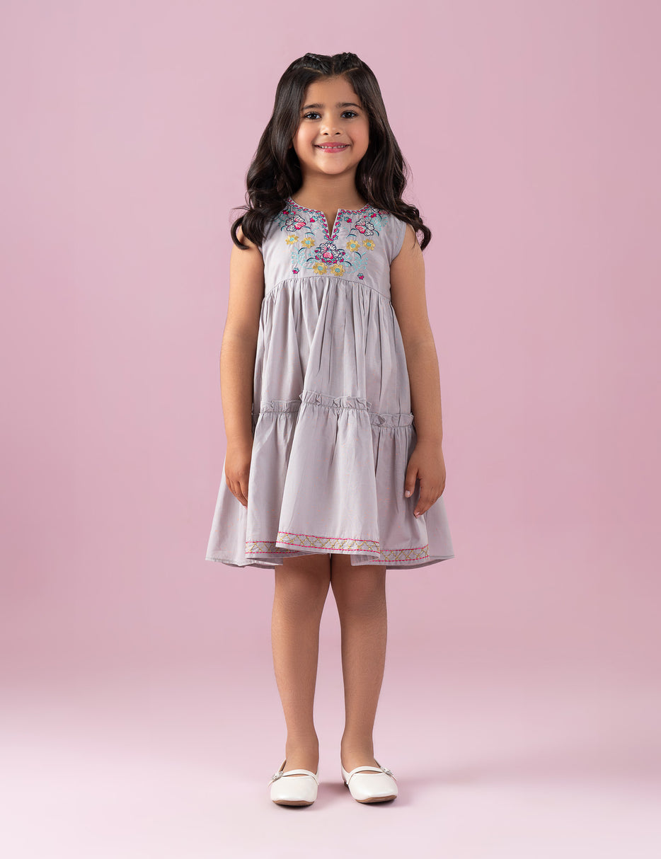 Graceful and charming, this Floral Embroidered Tiered Dress for Little Girls is designed to add a touch of elegance to her wardrobe. Crafted in a soft grey tone, it features beautiful floral embroidery on the neckline with delicate detailing that enhances its sweet appeal. The sleeveless design and tiered silhouette with subtle ruffle accents create a flowy, comfortable fit perfect for warm days. Ideal for parties, family gatherings, and special occasions, this dress blends comfort with timeless style.