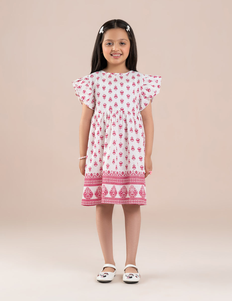 Add a touch of charm to your little one’s wardrobe with this beautiful white and pink floral printed dress. Crafted from soft, breathable cotton fabric, this dress ensures all-day comfort while keeping a stylish look. It features delicate all-over floral motifs with a traditional-inspired border print along the hem, giving it an elegant finish. The short flutter sleeves and gathered waist create a cute, comfortable fit, perfect for casual outings, festive occasions, or summer wear.