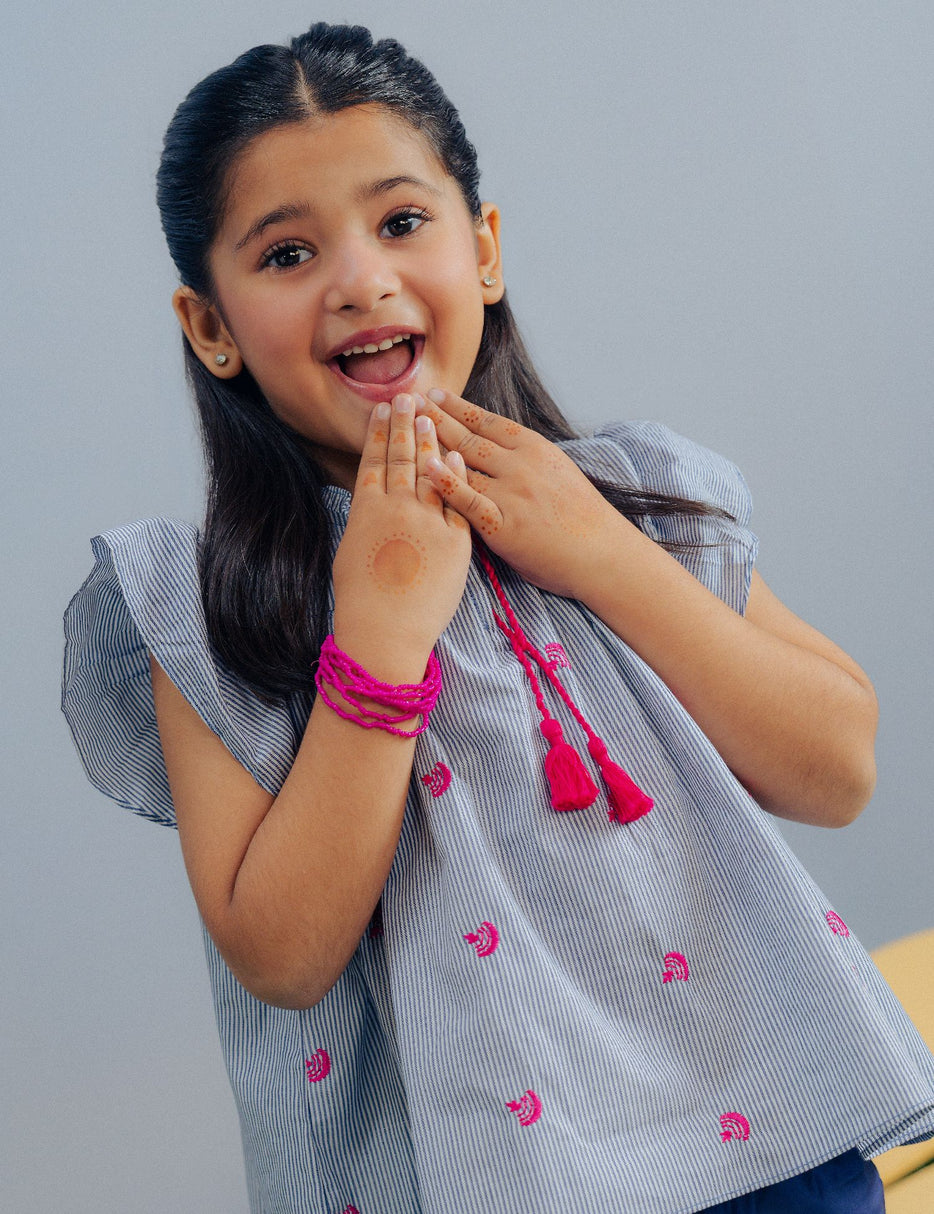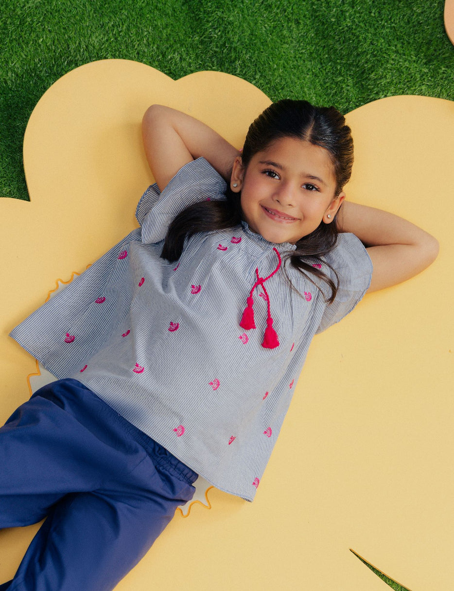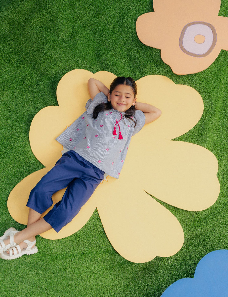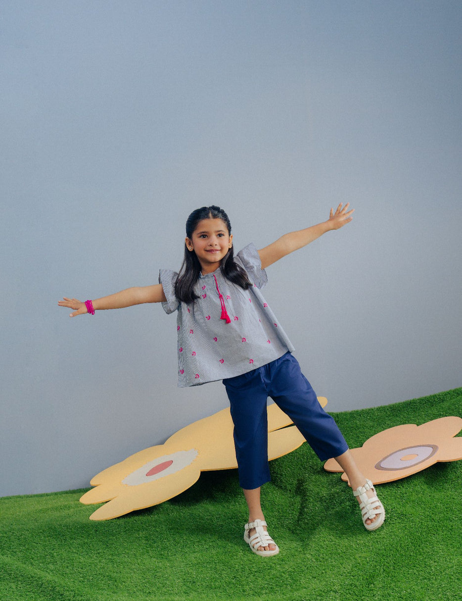 Keep your little one stylish and comfortable with this adorable 2-piece outfit. The set features a charming striped flared top with cute ruffle sleeves and delicate pink embroidered detailing, finished with decorative tassels at the neckline for a playful touch. The matching navy blue culotte pants come with an elastic waistband and drawstring, ensuring a secure and comfortable fit for all-day wear. Made from soft, breathable fabric, this outfit is perfect for casual outings, playdates, or family gatherings. A trendy yet comfortable set that adds a sweet and modern touch to your little girl’s wardrobe.