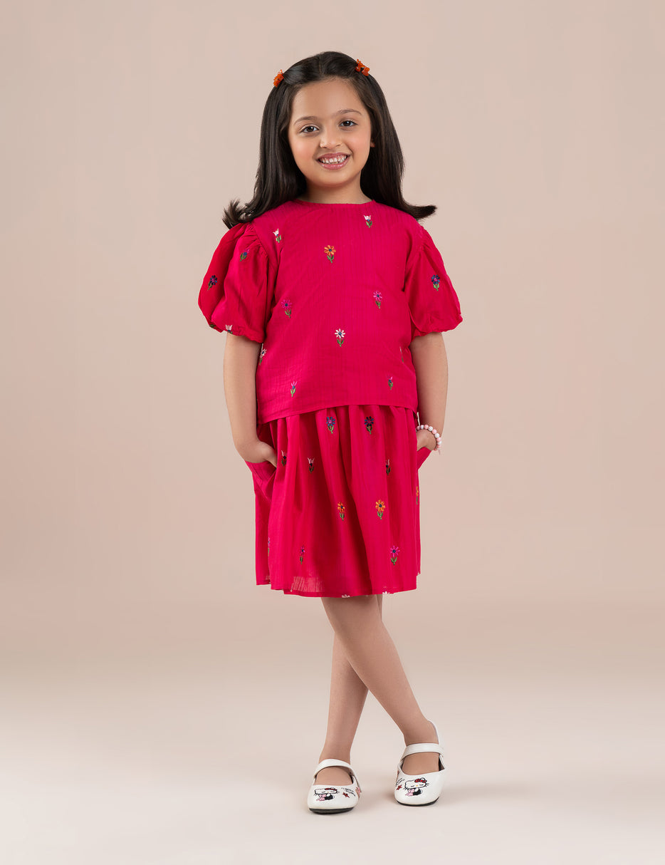 Dress her in charming elegance with this 2 Piece Floral Embroidered Suit for little girls. Designed with delicate floral embroidery on the front and a soft printed fabric, this beautiful set includes a stylish top paired with comfortable matching skirt. Made from lightweight, breathable material, it keeps her relaxed all day while looking effortlessly graceful. Perfect for festive occasions, family get-togethers, or casual outings.