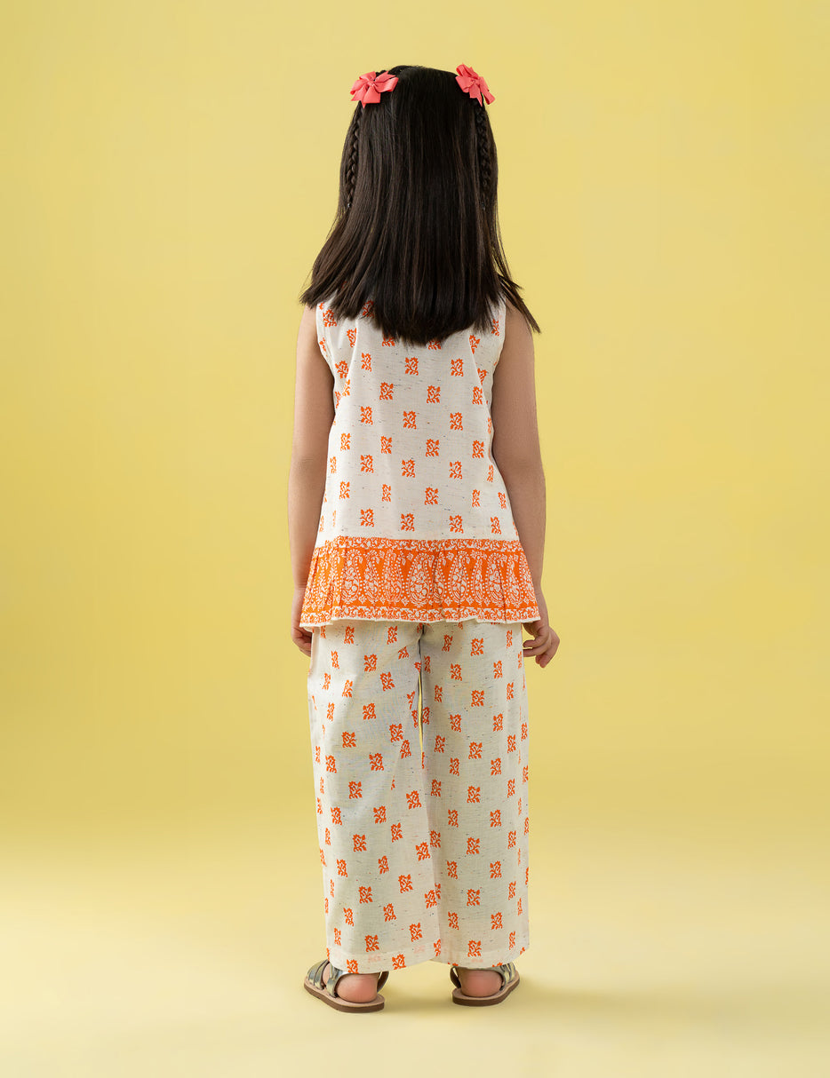 Bright, comfortable, and effortlessly stylish, this printed suit is perfect for little girls. The set features a soft, lightweight top with an all-over orange motif print and a decorative contrast border at the hem, paired with matching straight-fit pants for a coordinated look. Made from breathable fabric, it keeps her comfortable throughout the day—whether for playtime, casual outings, or festive gatherings. Easy to wear and gentle on the skin, this charming set blends traditional-inspired design with everyday comfort.