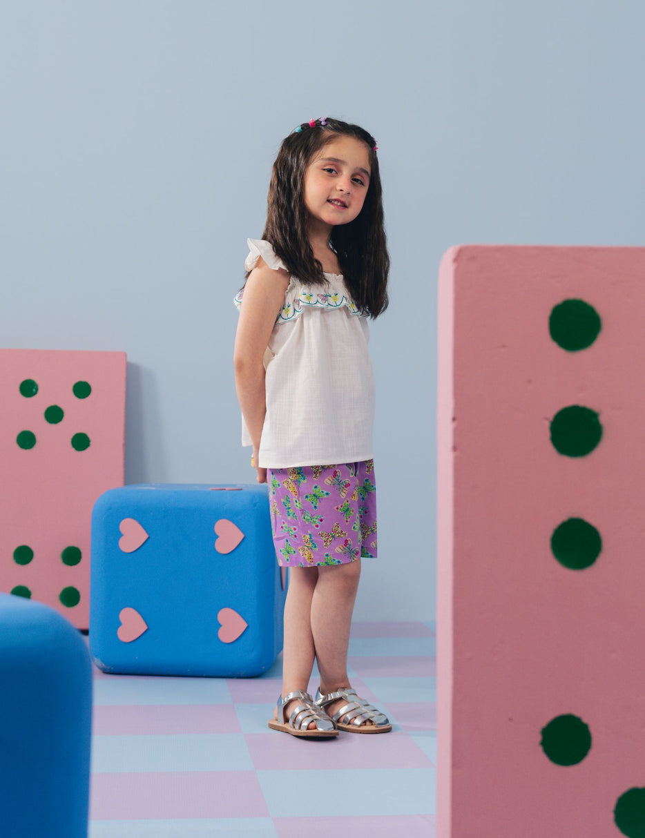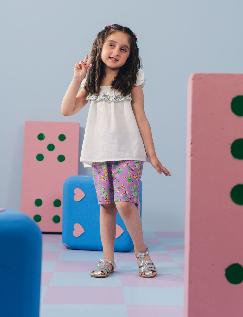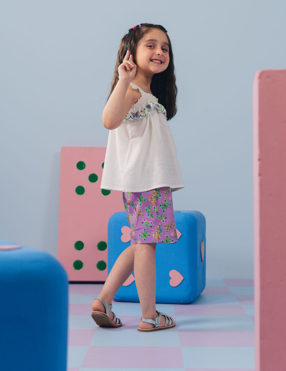 Brighten up your little girl’s wardrobe with this adorable 2 Piece Butterfly Printed Suit for Little Girls. This cute outfit features a soft sleeveless top with ruffle straps and a beautifully embroidered butterfly neckline, adding a sweet and charming touch. It is paired with colorful butterfly printed shorts that create a fun and playful look. Made from lightweight and breathable fabric, this set ensures all-day comfort for active little ones. Perfect for summer days, playdates, and casual outings, this stylish outfit keeps your little girl looking cute and comfortable.