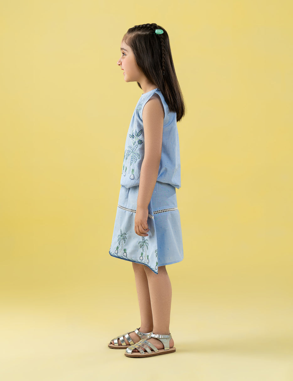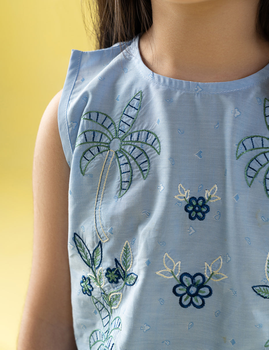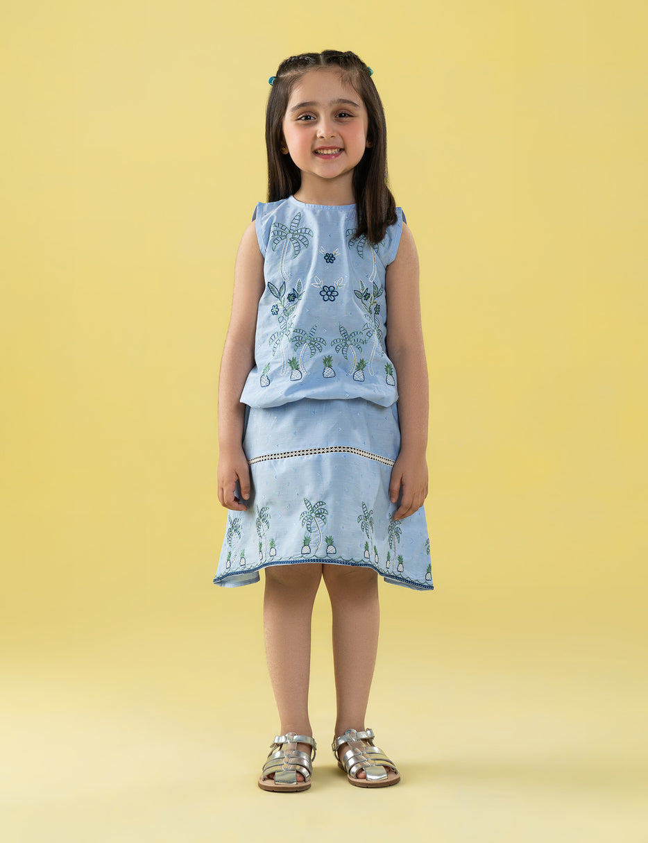 Dress her in charming summer style with this adorable 2 piece set for little girls. Featuring a sleeveless embroidered top paired with a matching skirt, this outfit showcases delicate tropical-inspired embroidery for a fresh and playful look. Made from soft, breathable fabric, it ensures all-day comfort while the relaxed fit allows easy movement. Perfect for casual outings, playdates, or warm-weather occasions, this coordinated set is a sweet and stylish addition to her wardrobe.