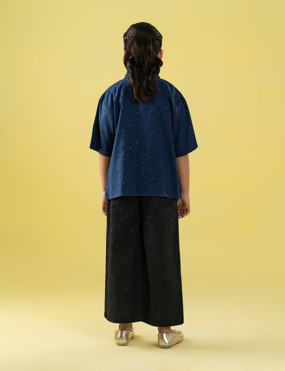 Brighten her wardrobe with this charming 2 piece embroidered suit, designed for comfort and elegance. The short-sleeve top features a neat collar and delicate lace-style detailing along the front and hem, perfectly paired with matching straight-leg trousers accented with coordinated side trims. Crafted from lightweight, breathable fabric, this outfit is ideal for festive occasions, family gatherings, or summer outings. A graceful and cheerful ensemble for girls who love stylish comfort.
