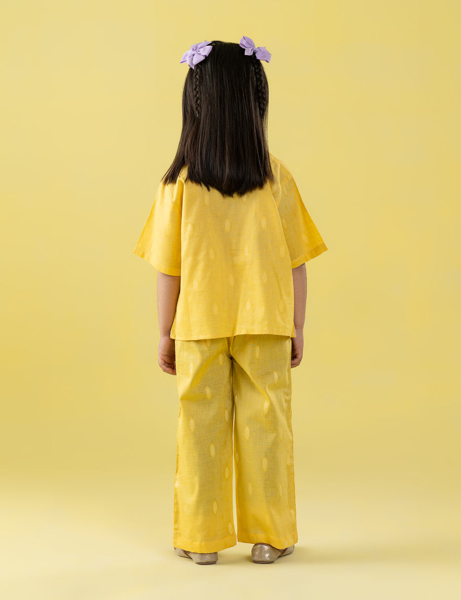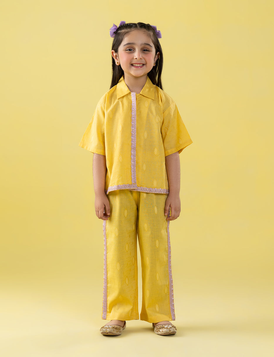 Brighten her wardrobe with this charming 2 piece embellished suit, designed for comfort and elegance. The short-sleeve top features a neat collar and delicate lace-style detailing along the front and hem, perfectly paired with matching straight-leg trousers accented with coordinated side trims. Crafted from lightweight, breathable fabric, this outfit is ideal for festive occasions, family gatherings, or summer outings. A graceful and cheerful ensemble for little girls who love stylish comfort.