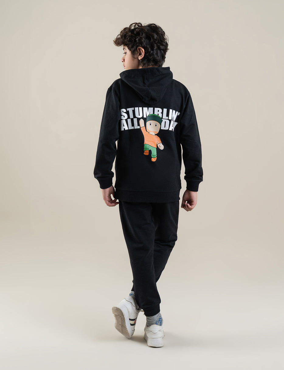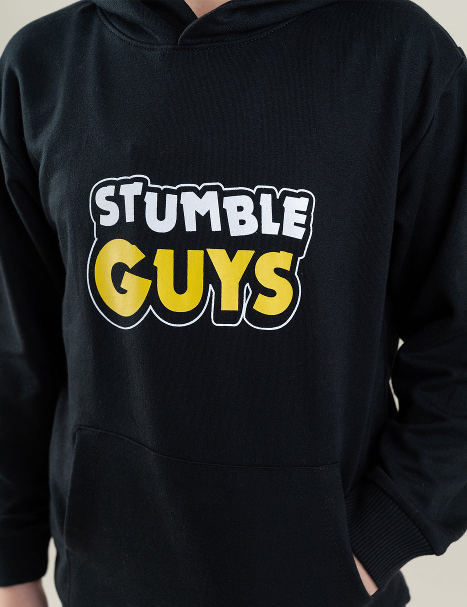 Let your boy show off his gamer style with this 2 Piece Stumble Guys Printed Suit. This trendy set includes a hooded sweatshirt and matching jogger pants, both featuring fun Stumble Guys prints. Designed in classic black with bright yellow side stripes, this outfit combines comfort and style—perfect for school, play, or casual outings.