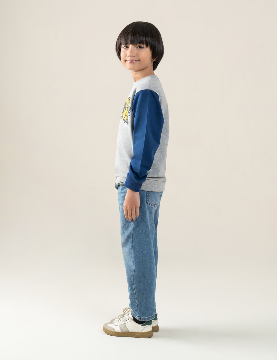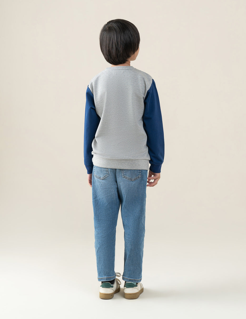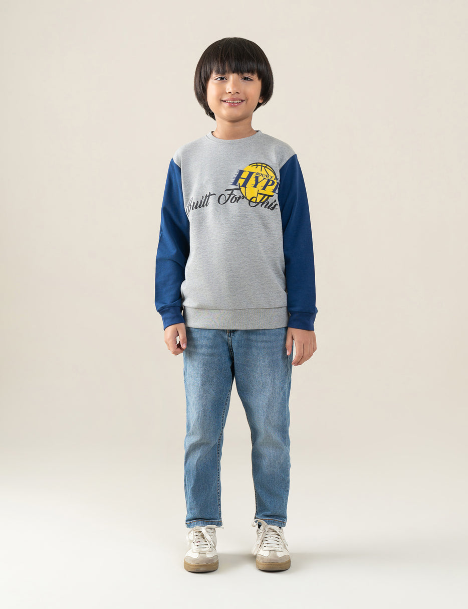 This sporty and comfortable sweatshirt is designed for active little boys who love bold style. Featuring a trendy “Built For This” graphic with a basketball-inspired print, it adds a cool, energetic vibe to everyday outfits. The grey body paired with contrasting navy sleeves gives it a modern look, while the soft fabric and ribbed cuffs ensure all-day comfort. Perfect for casual wear, school, or outdoor play.