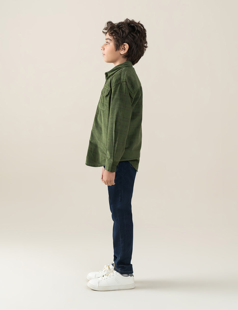 This olive green button-down shirt for boys features a clean and classic design with subtle check detailing. Made from soft, breathable fabric, it includes long sleeves, a structured collar, and two front flap pockets for added style. Perfect for casual outings or semi-formal occasions, this versatile shirt pairs well with jeans, chinos, or shorts for a smart, stylish look.