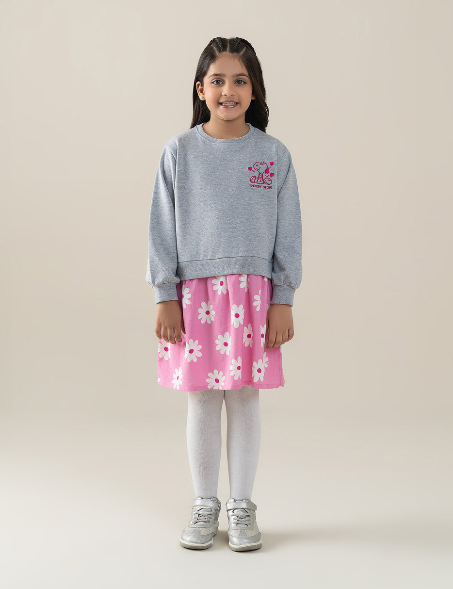 This adorable Snoopy dress is the perfect blend of comfort and cuteness for little girls. The grey top features a sweet Snoopy graphic with hearts, bringing a playful and loving vibe to her look. The dress transitions into a soft pink skirt decorated with bright white daisies, adding a cheerful, girly touch. Cozy, stylish, and easy to wear — ideal for everyday outings, playdates, or casual occasions!