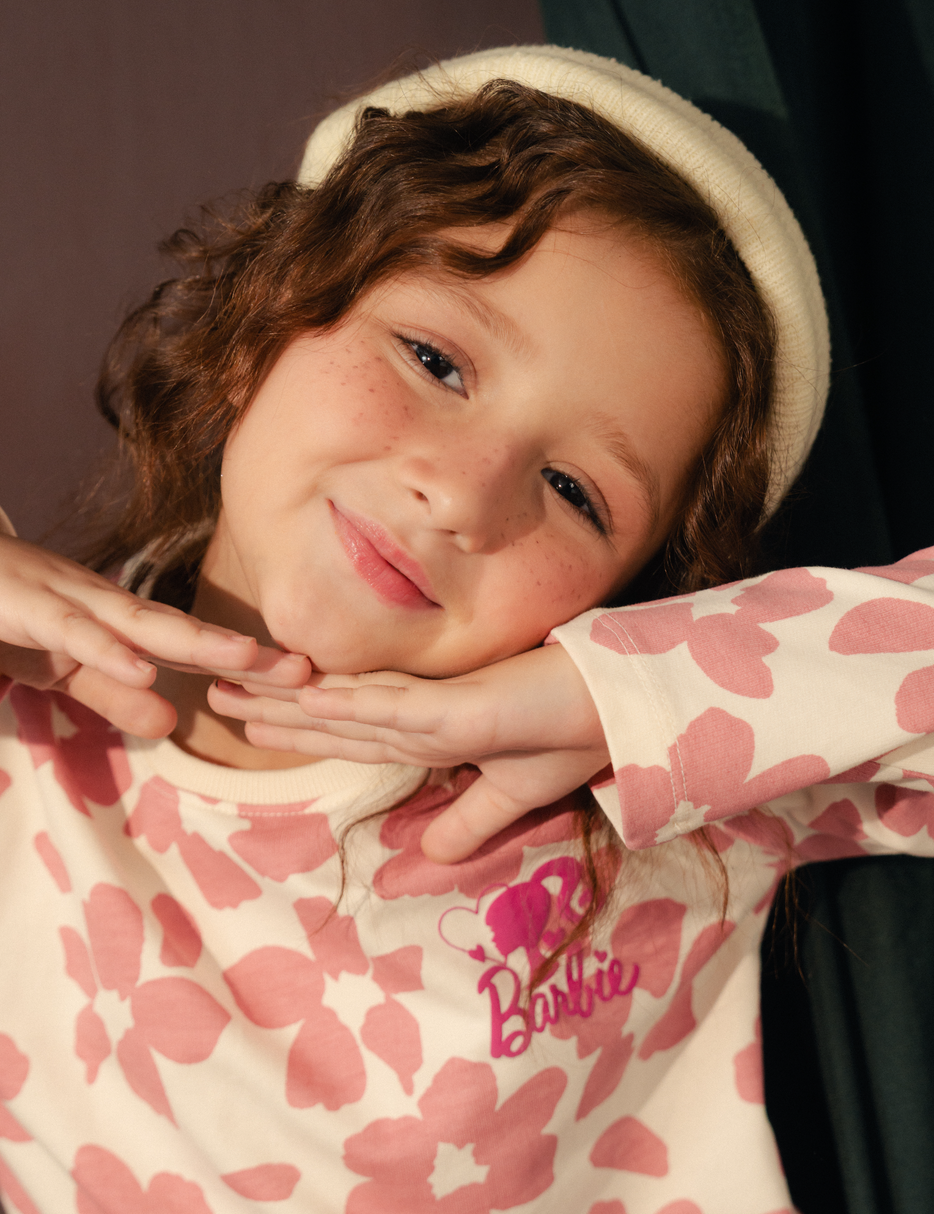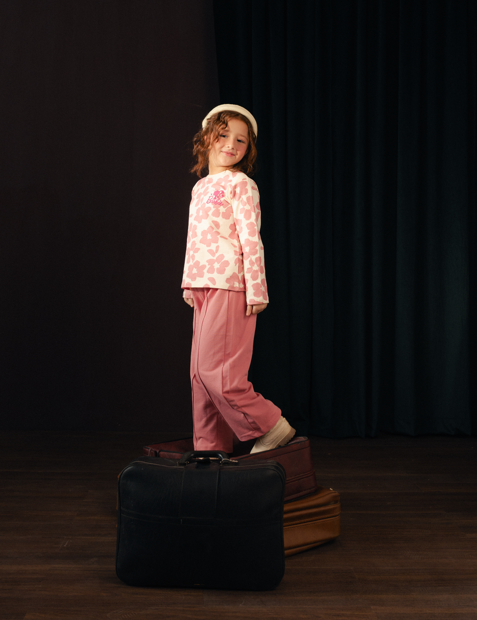 This adorable 2-piece outfit is perfect for your fashionista! It features a cream long-sleeve top with bold pink floral prints and a cute “Barbie” logo, paired with matching dusty pink wide-leg pants. Made from soft and breathable fabric, this set offers both comfort and style — ideal for casual outings, playdates, or everyday wear.