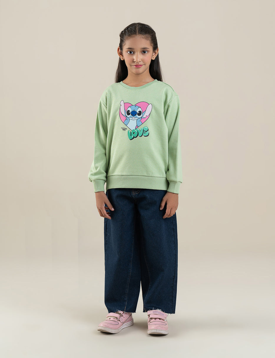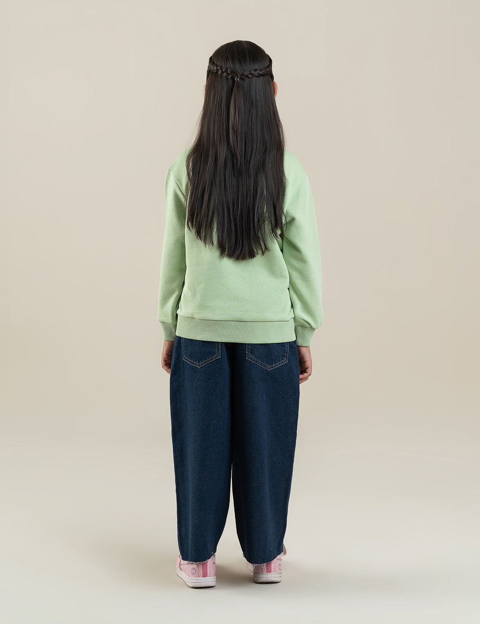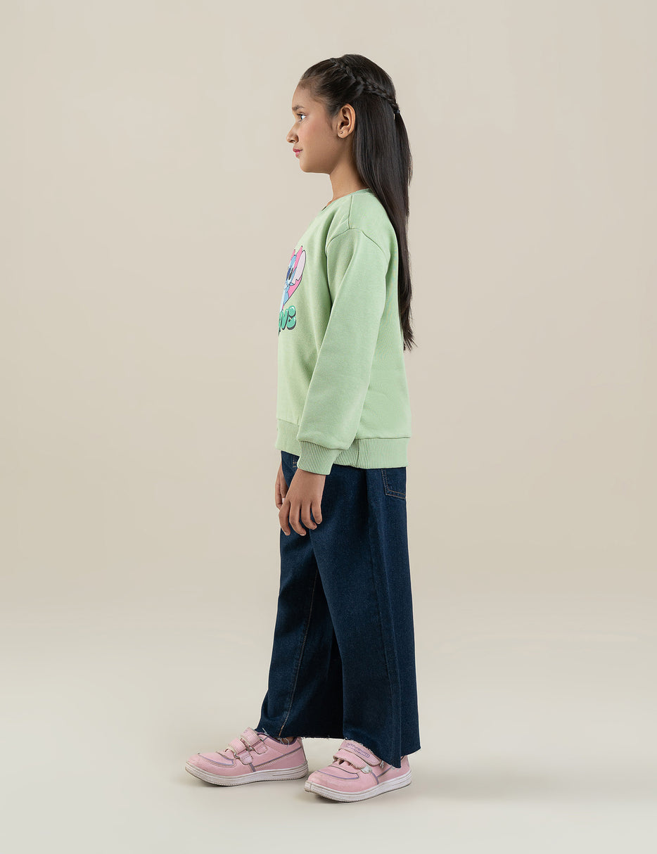 Cozy and cute light green sweatshirt for girls featuring an adorable cartoon character print with the word “LOVE” on the front. Designed with ribbed cuffs, neckline, and hem for a comfortable fit. Made from soft, warm fabric — perfect for casual wear, playtime, or chilly days.