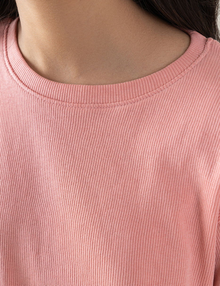 A soft and stylish ribbed long sleeve t-shirt designed for everyday comfort. This blush pink tee features a gentle stretch, a classic round neckline, and cute lettuce-edge hems for a sweet, girly touch. Perfect for layering or wearing on its own—ideal for school, playdates, and casual outings. A must-have basic for her wardrobe!