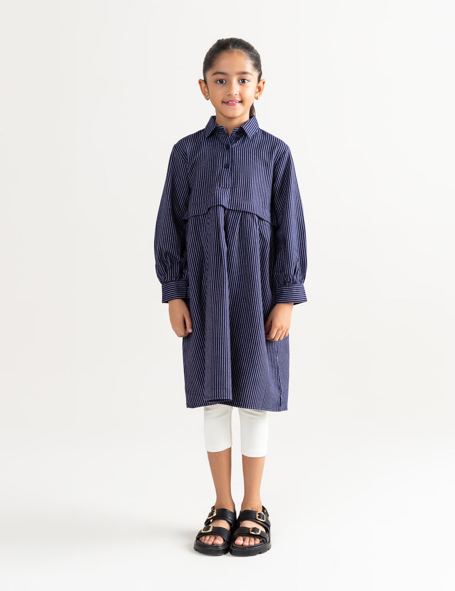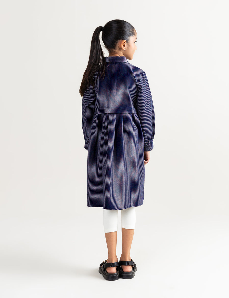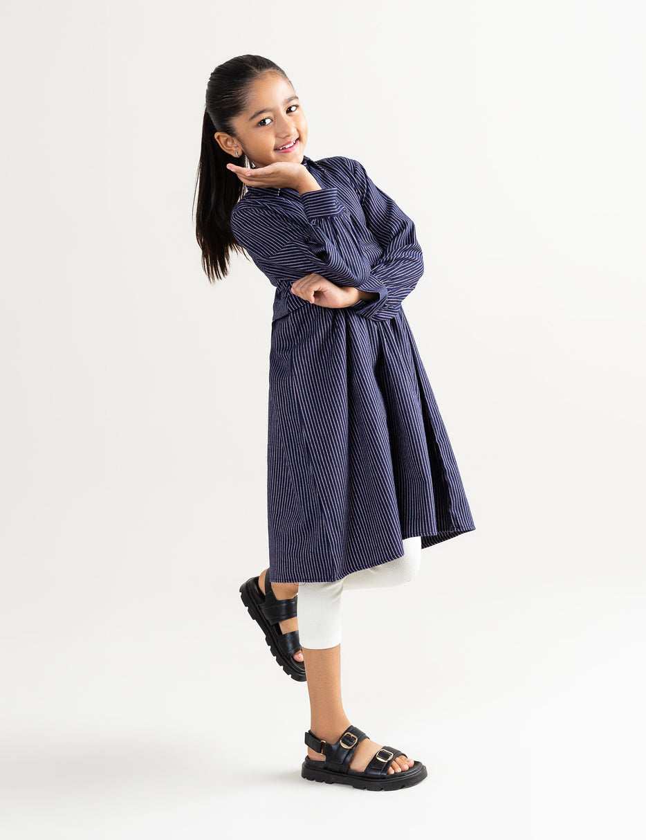 This elegant navy blue striped long shirt dress for girls combines comfort and style effortlessly. Designed with a collared neckline, front buttons, and long puff sleeves with cuffs, it offers a chic and polished look. The soft, breathable fabric ensures ease of movement, making it perfect for school, family gatherings, or casual outings. The vertical stripe pattern adds a touch of sophistication, making this dress a timeless wardrobe favorite.