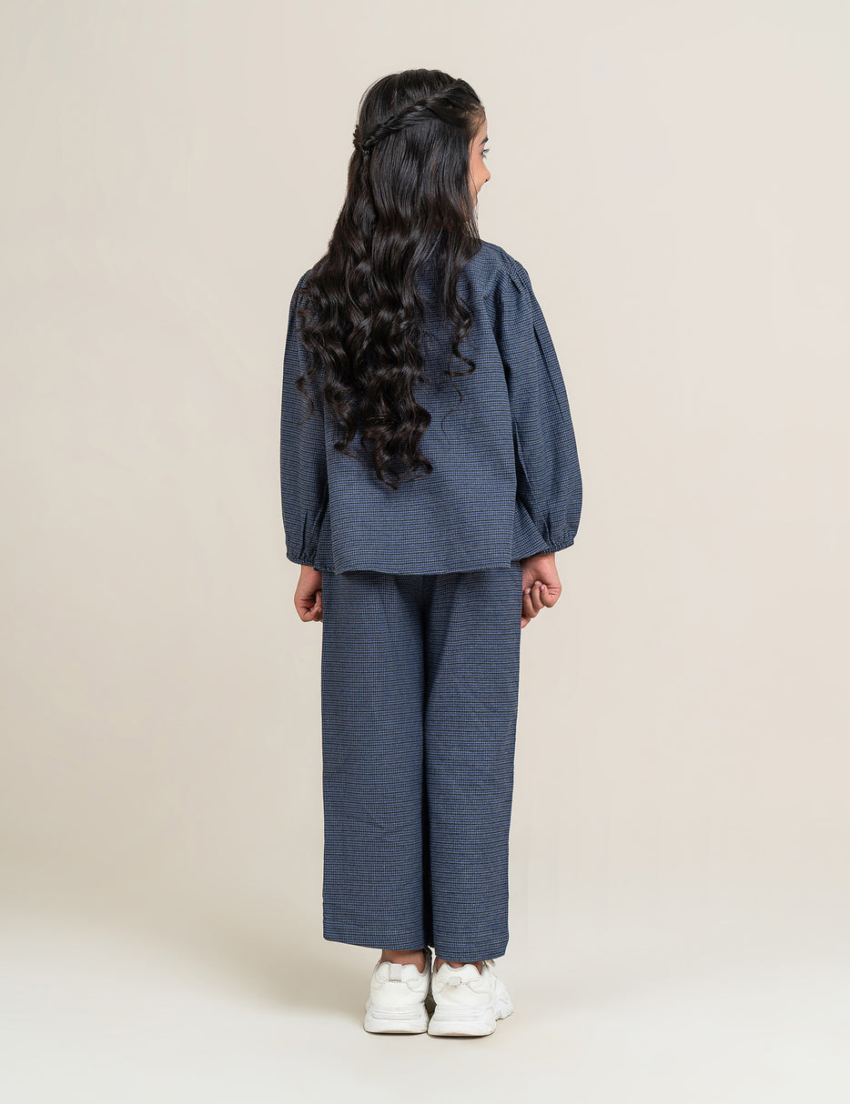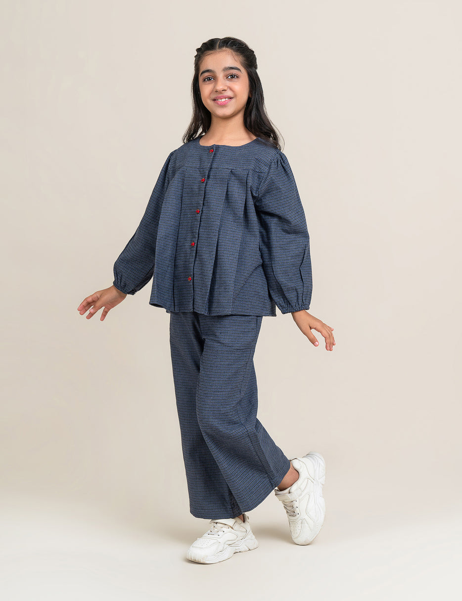 This stylish girls’ two-piece set features a charming checkered pattern with a button-down top and matching pants. The top is designed with eye-catching red buttons that add a fun pop of color, along with gathered details for a soft, comfortable fit. The coordinating pants come with an elastic waistband for easy wear and flexibility. Perfect for casual outings, family gatherings, or everyday comfort, this outfit offers a blend of classic style and cozy practicality.