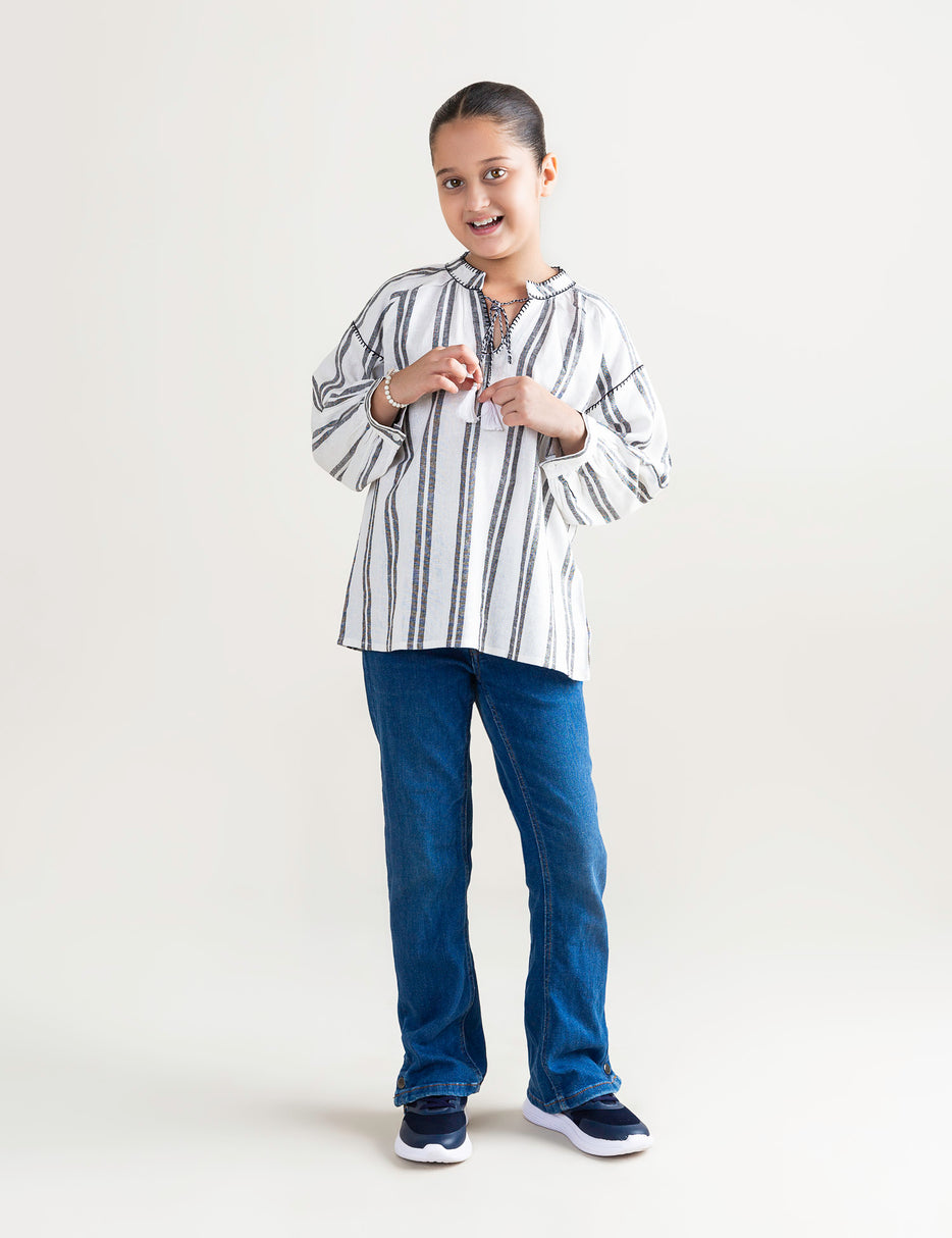 This stylish black and white striped peasant top for girls combines traditional charm with modern comfort. Featuring a round neckline with a tasseled tie detail and three-quarter puff sleeves, it offers a relaxed yet elegant look. The soft, breathable fabric ensures comfort for all-day wear, making it perfect for casual outings, family gatherings, or school events. The contrast stitching along the neckline and sleeves adds a refined finishing touch.