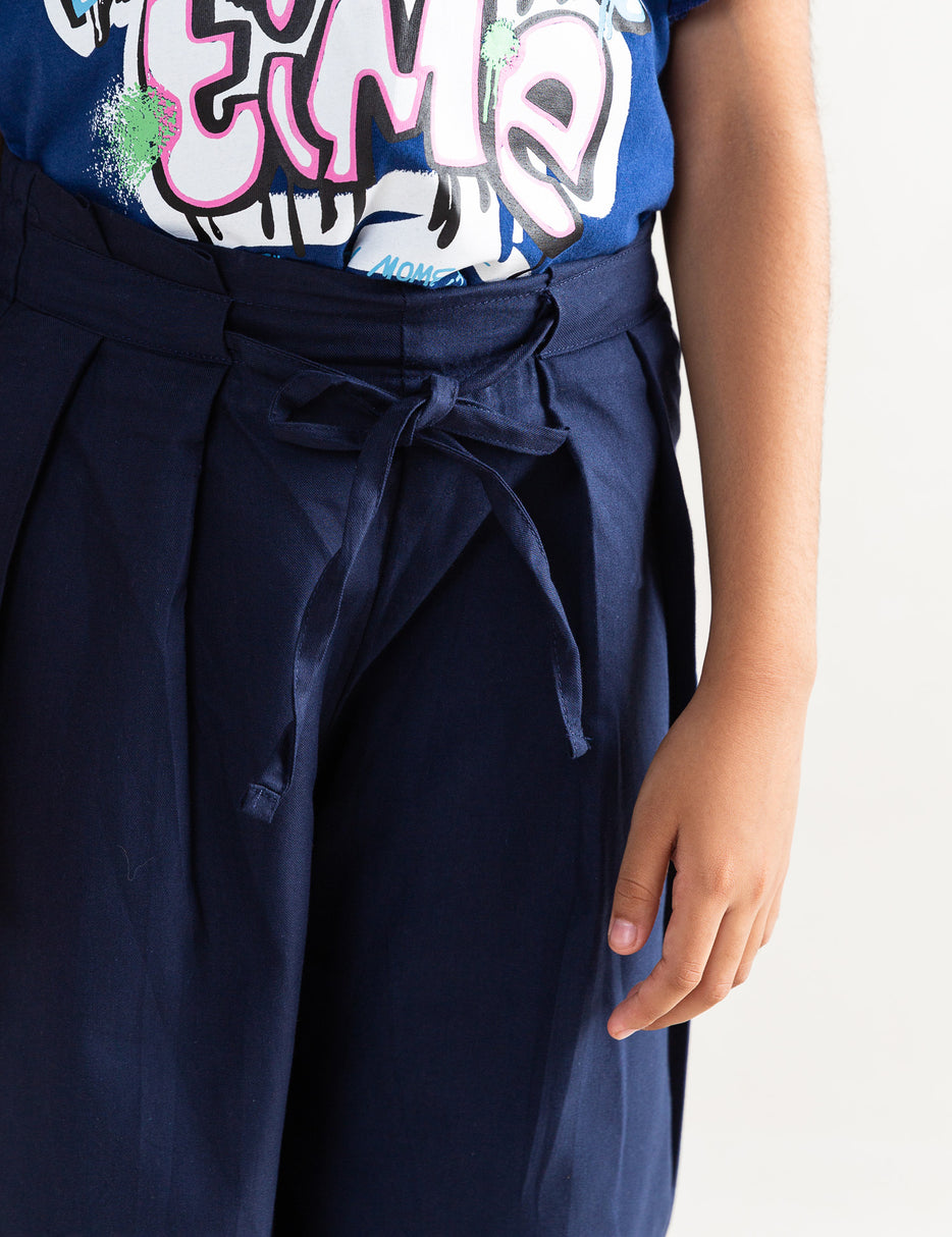 These girls’ navy blue wide-leg culottes are the perfect blend of comfort and chic style. Featuring a soft, flowy silhouette with a high waist and a matching tie belt, they offer a fashionable and relaxed fit. The breathable fabric ensures all-day comfort, while the wide-leg design adds a modern, trendy touch. Ideal for casual outings, parties, or family get-togethers, these culottes can be paired effortlessly with tops, blouses, or tees for a stylish look.