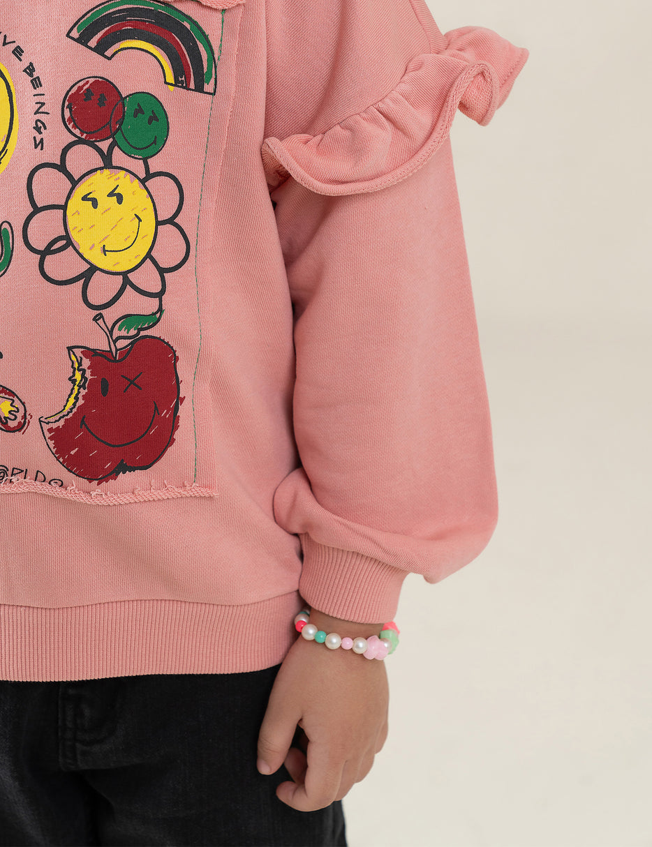 Brighten your little girl’s day with this adorable pink “Smiley World” sweatshirt featuring cheerful prints and positive vibes! The front showcases playful smiley faces, flowers, and rainbows with the uplifting message “We Are Positive People.” Designed with cute ruffle details on the shoulders and ribbed cuffs for extra comfort, this sweatshirt is perfect for casual outings, playdates, or cozy days at home.