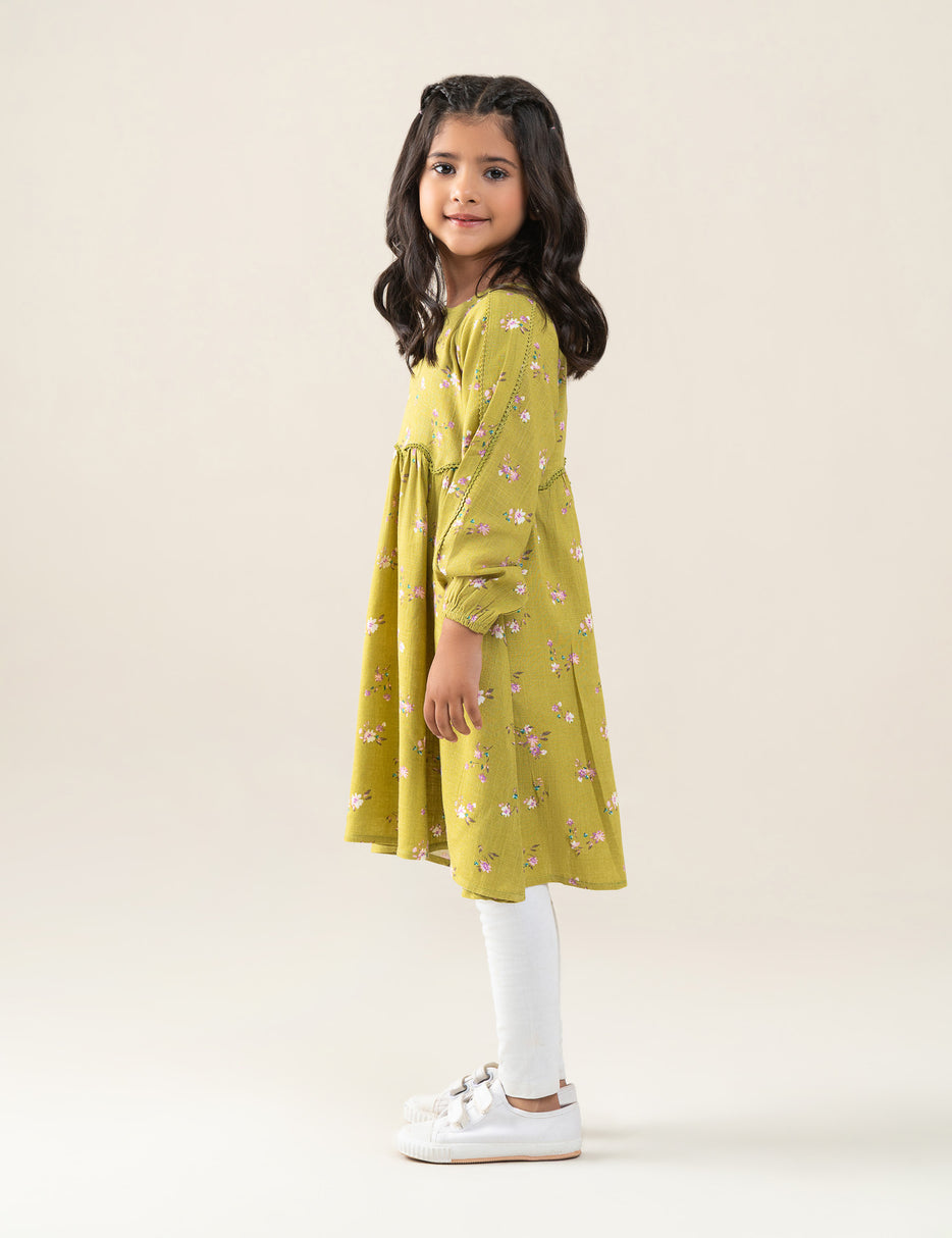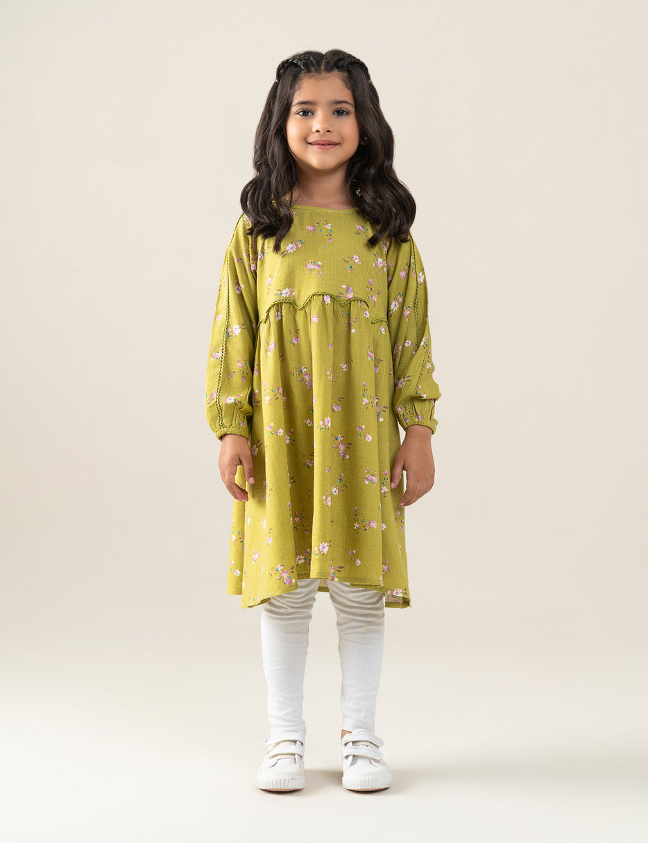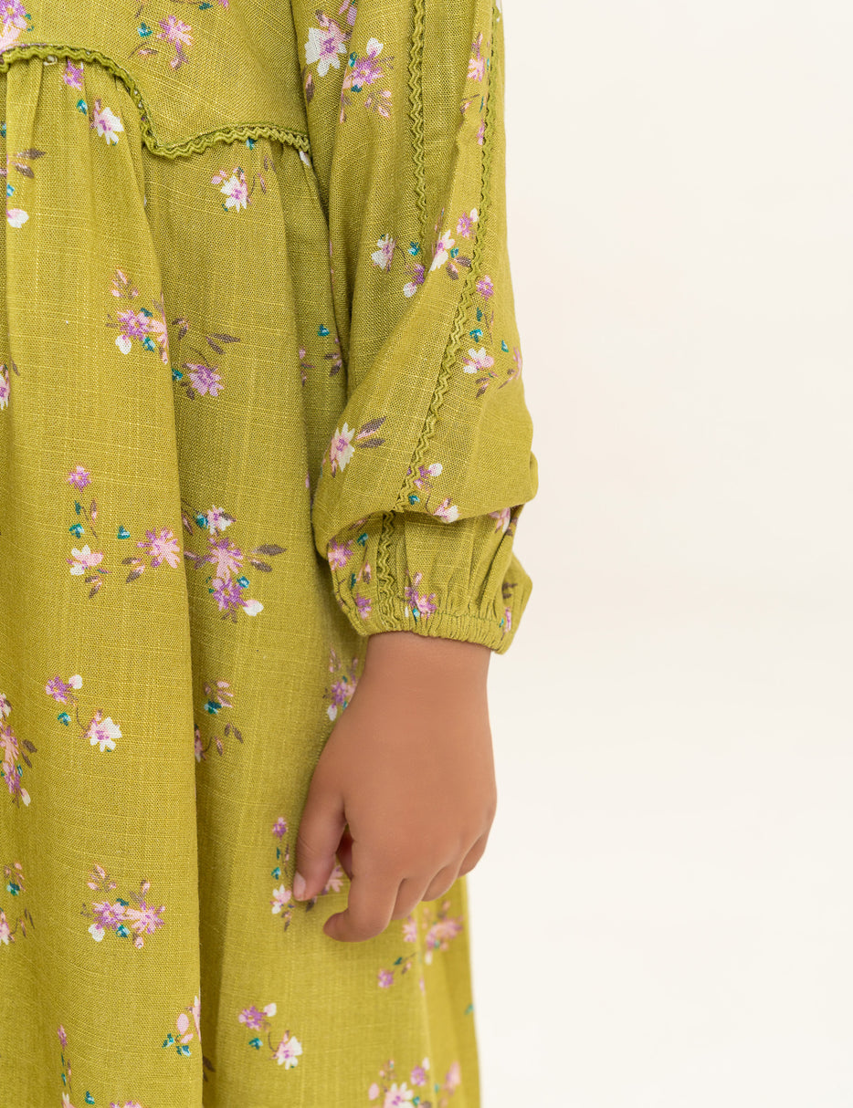 Add a fresh and charming look to your little girl’s wardrobe with this beautiful floral printed dress. Designed in a soothing green tone with delicate all-over floral prints, this dress features long sleeves with gentle gathers and a comfortable, flowy silhouette. Made from soft, breathable fabric, it ensures all-day comfort while allowing easy movement. Perfect for casual outings, playdates, or special occasions, this dress blends comfort with timeless style.