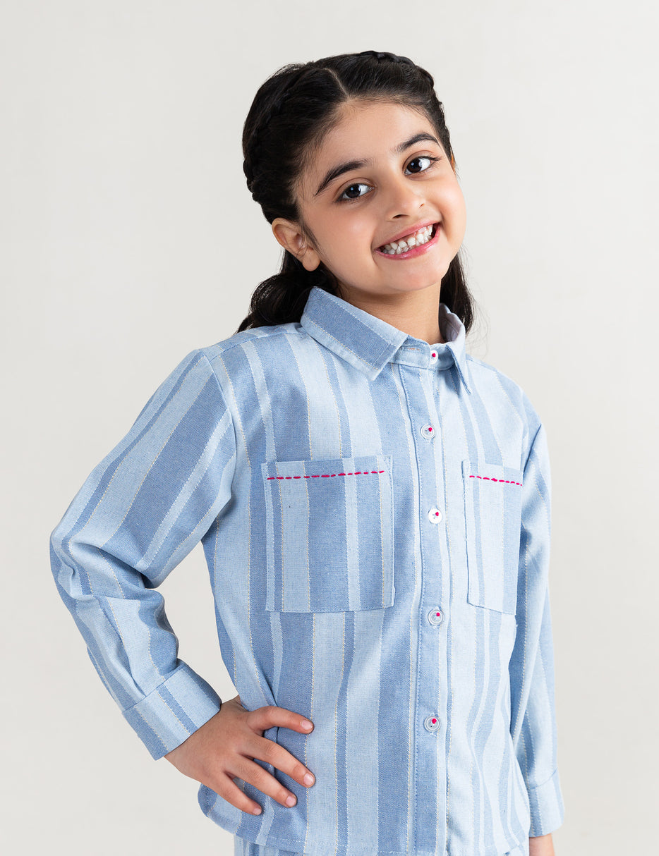 This charming two-piece outfit for girls features a light blue striped button-up shirt with front pockets and coordinating straight-cut pants. Made from soft, breathable fabric, it offers all-day comfort and easy movement. The subtle pink stitching detail adds a cute touch to the classic striped design. Perfect for casual outings, school days, or family gatherings, this set blends style and comfort effortlessly.