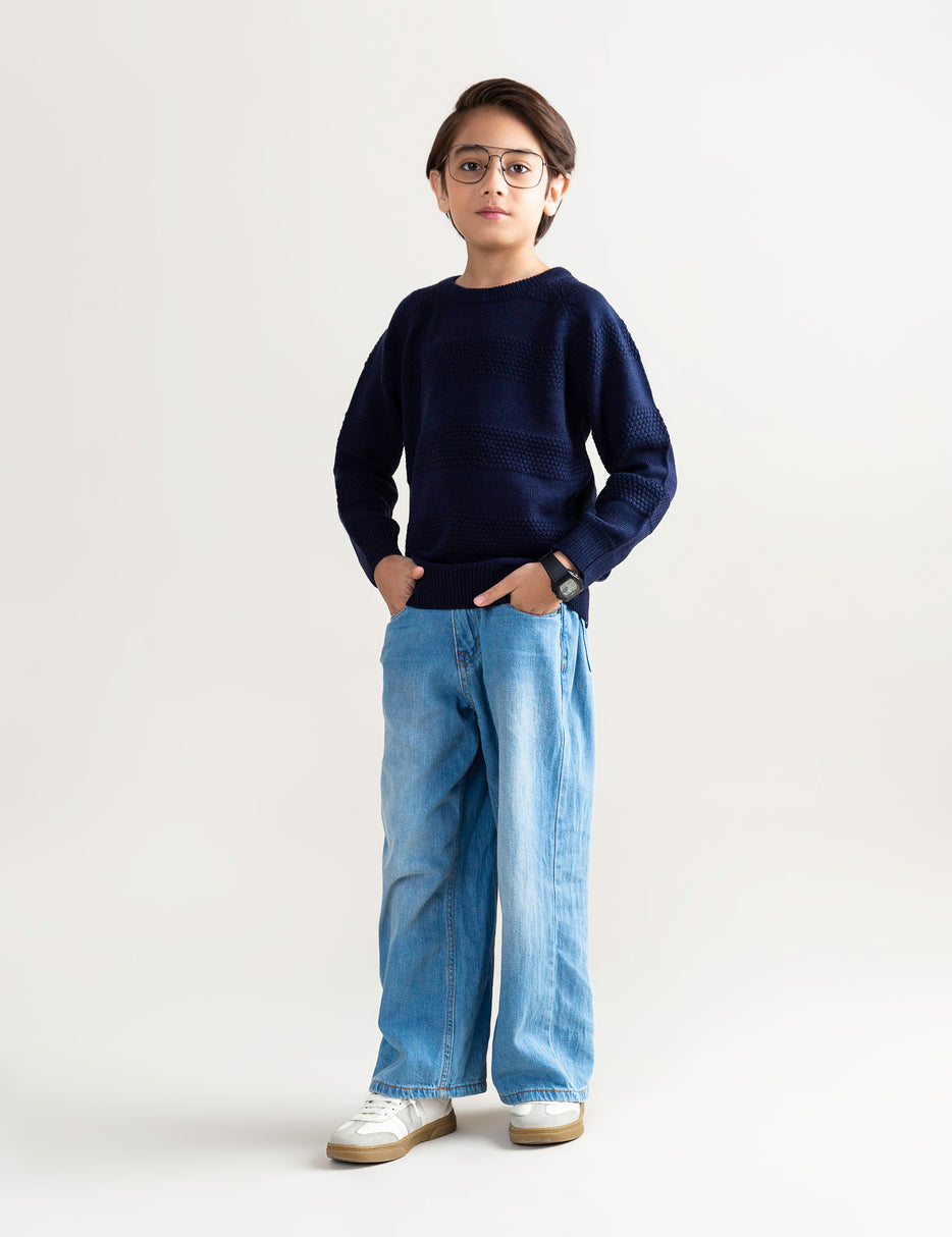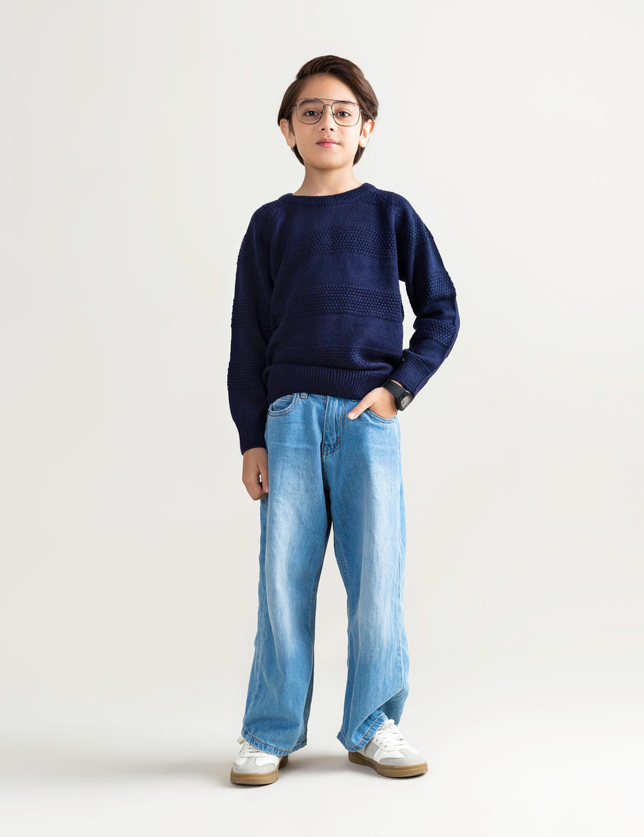 This timeless navy blue sweater features a clean, minimal design with a cozy knit texture. Crafted with a crew neckline and ribbed cuffs and hem, it offers a comfortable fit and versatile style. Perfect for layering or wearing on its own, this sweater adds a touch of warmth and sophistication to any casual or smart-casual outfit.