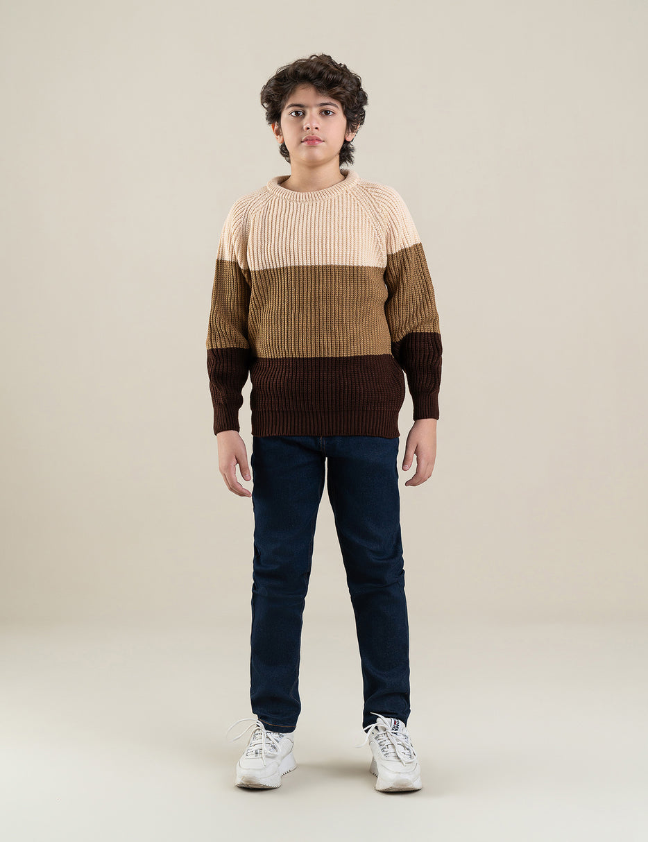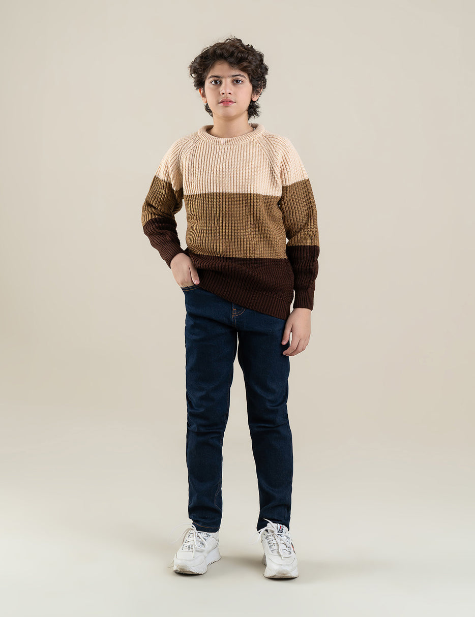 This color block knit sweater for boys is the perfect mix of warmth, comfort, and modern style. Featuring a cozy two-tone design in beige and brown, it adds a trendy touch to your little one’s winter wardrobe. Crafted from soft, textured knit fabric, this pullover provides excellent insulation while remaining lightweight and breathable. The ribbed neckline, cuffs, and hem ensure a comfortable and secure fit, making it great for both casual outings and chilly school days.
