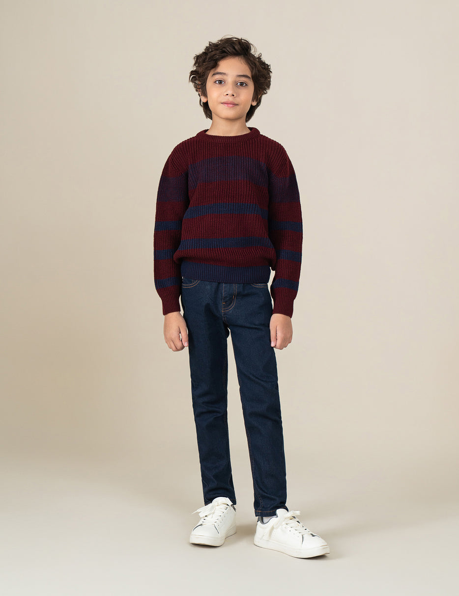 Add a classic touch to your boy’s wardrobe with this striped knit sweater. Designed with bold red and navy stripes, it offers a timeless look with a cozy feel. Made from soft, warm fabric for all-day comfort, this sweater is perfect for layering during chilly weather. Ideal for school days, family outings, or casual gatherings.