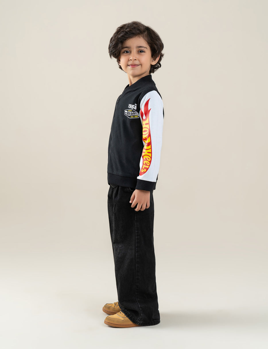 Give his everyday look a bold, sporty upgrade with this Hot Wheels–themed zip-up jacket for little boys. Featuring a classic black body with contrasting white sleeves and a vibrant Hot Wheels logo print on one arm, this jacket brings all the racing-adventure energy he loves. Designed with a comfortable fit, ribbed cuffs, and an easy front zipper, it's perfect for casual outings, school days, or layering in cooler weather. A must-have for every mini car enthusiast!