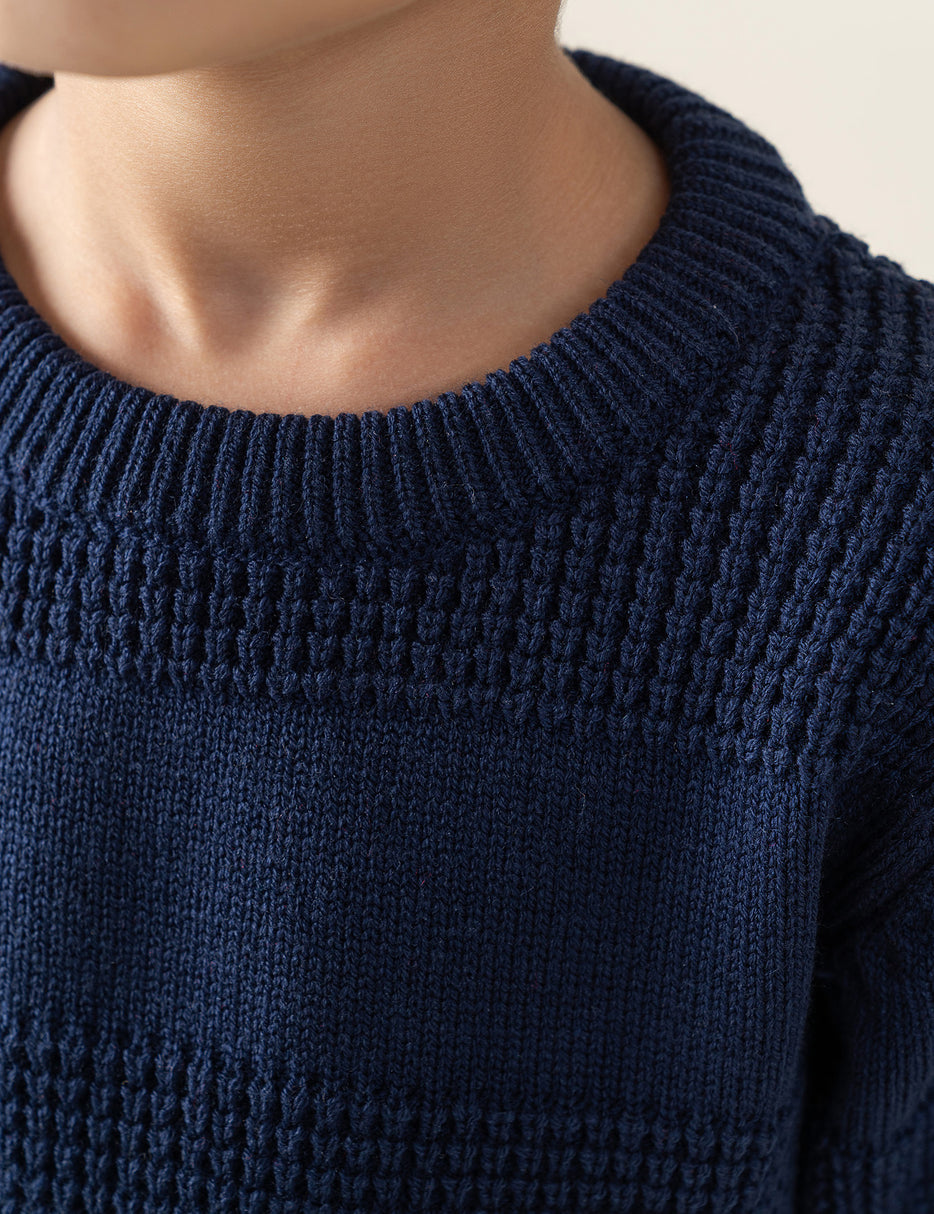 Keep him cozy in style with this textured navy knit sweater, designed with alternating waffle and smooth knit panels for a classic, premium look. The soft, warm fabric ensures all-day comfort, while the ribbed neckline, cuffs, and hem provide a snug fit. Perfect for casual outings, family gatherings, or layering on chilly days — a timeless wardrobe essential for little boys.