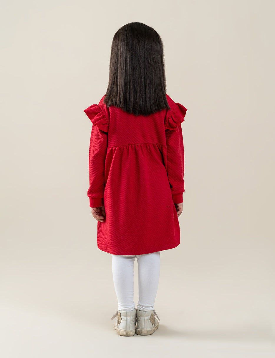 This adorable red dress for little girls features charming ruffle details on the shoulders and a softly gathered waistline for a sweet, classic look. Made from a textured, comfortable fabric, it offers both style and ease for everyday wear or special occasions. The long sleeves provide warmth, making it perfect for cooler days. A bright and beautiful choice that adds a touch of elegance to any little girl’s wardrobe.