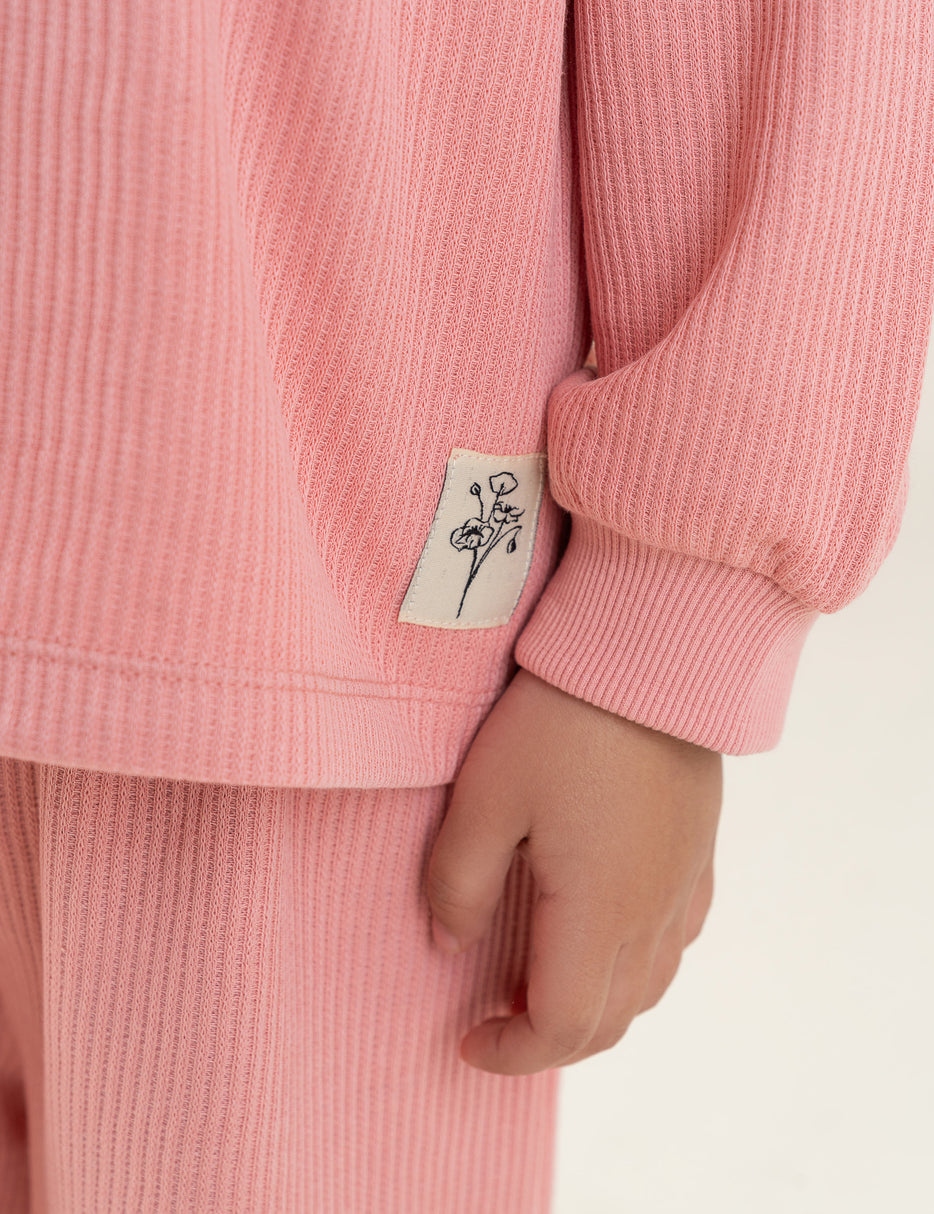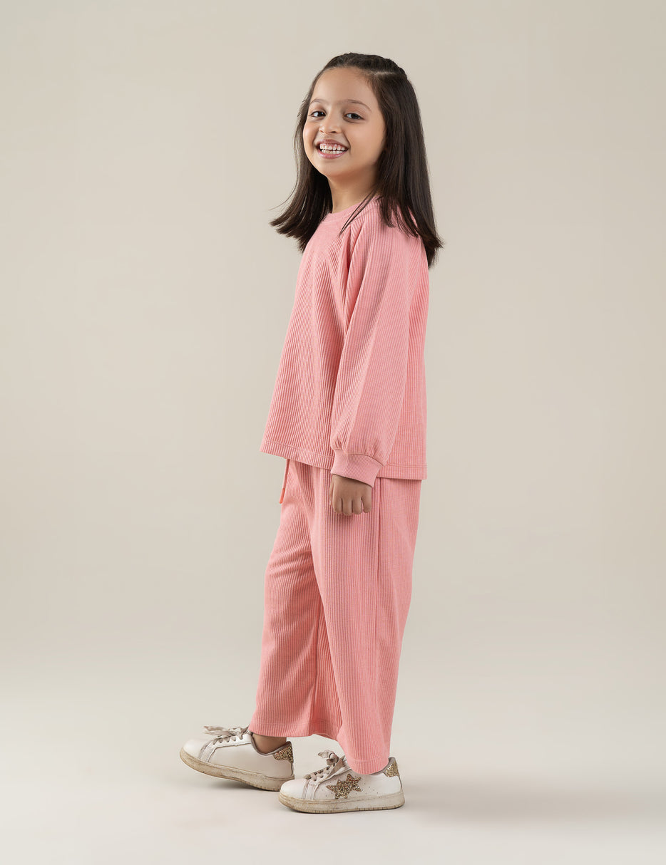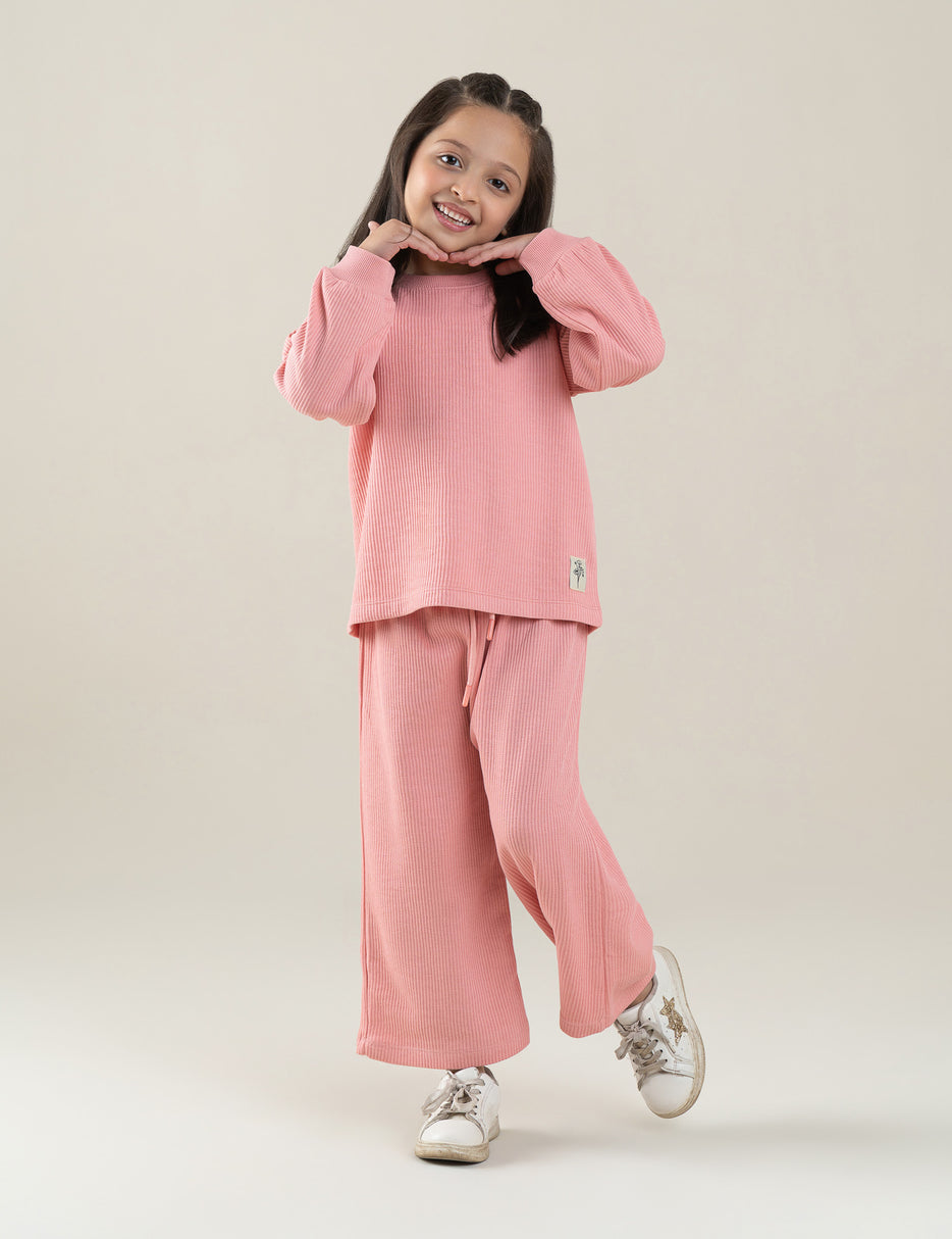 Keep her cozy and stylish with this 2-piece ribbed suit for little girls. Made from soft, breathable fabric, it features a long-sleeve top with comfy raglan sleeves and matching wide-leg trousers with an adjustable waistband for a perfect fit. The gentle blush pink shade adds a sweet, minimal look—ideal for everyday wear, playtime, or relaxed outings. Comfortable, cute, and effortlessly trendy!