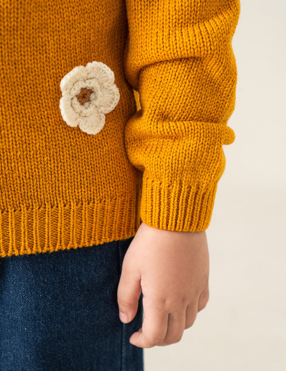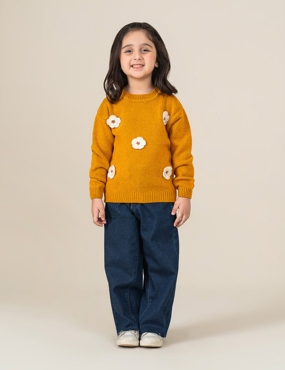 Brighten up your little girl’s winter wardrobe with this Floral Appliqué Knitted Sweater. Crafted in a warm mustard yellow hue, it features adorable 3D white flower appliqués for a charming touch. The soft knit fabric ensures cozy comfort and warmth, making it perfect for chilly days. A stylish blend of cuteness and comfort for everyday wear!