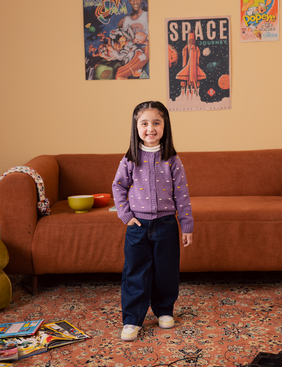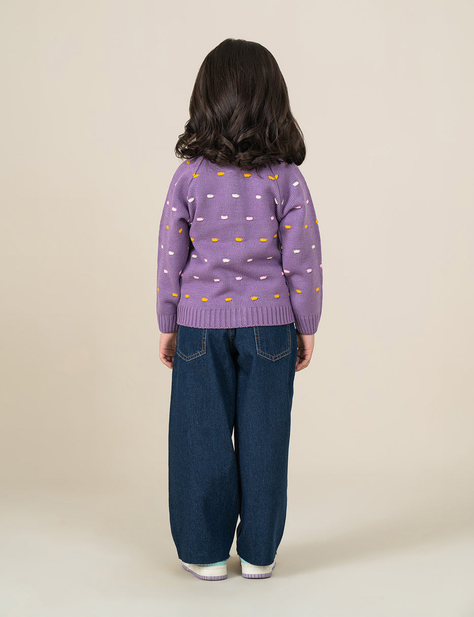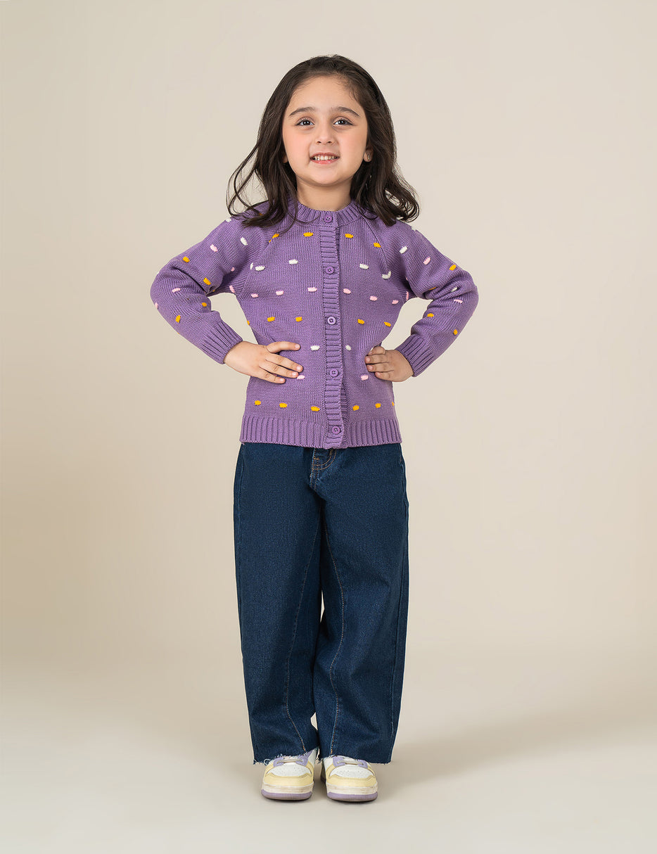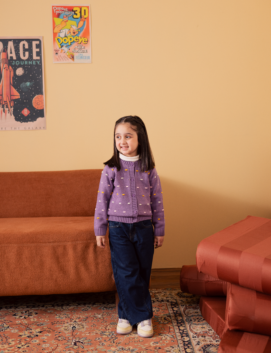 This cozy and adorable cream knit cardigan is perfect for little girls, featuring playful polka dots in cheerful shades of yellow, pink, and purple. Designed with large wooden buttons and soft, chunky knit fabric, it provides both warmth and style. Ideal for layering over dresses, tops, or tees, this cardigan adds a fun and charming touch to any outfit—great for everyday wear or special outings.