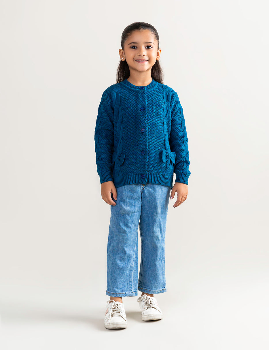 This charming teal cardigan features a cozy cable knit design with adorable bow accents on the front. Made from soft, warm fabric, it offers both comfort and style for cooler days. The button-up front and round neckline give it a classic look, perfect for layering over dresses or tops for a cute and polished outfit.