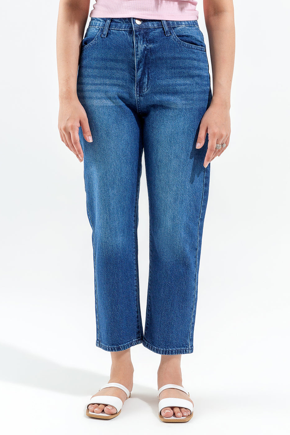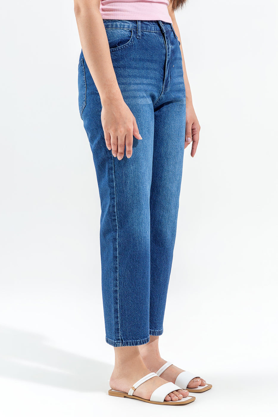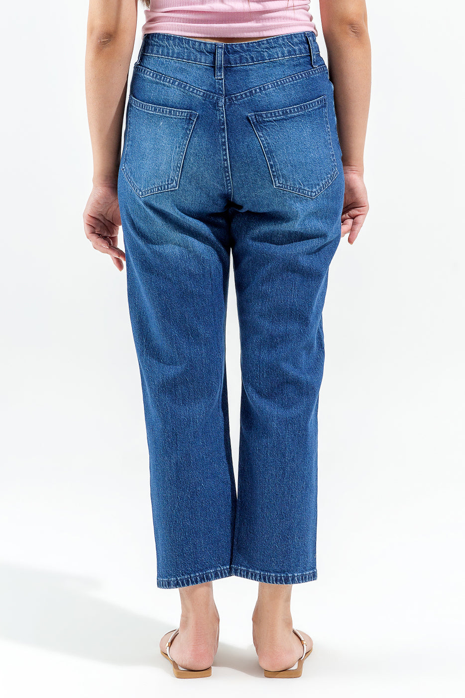 - Description: High-waist ankle length jeans with four pockets design in mid-dark wash. Front zip fly and metal button̴Ì?fastening.