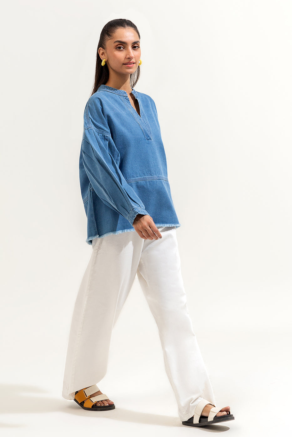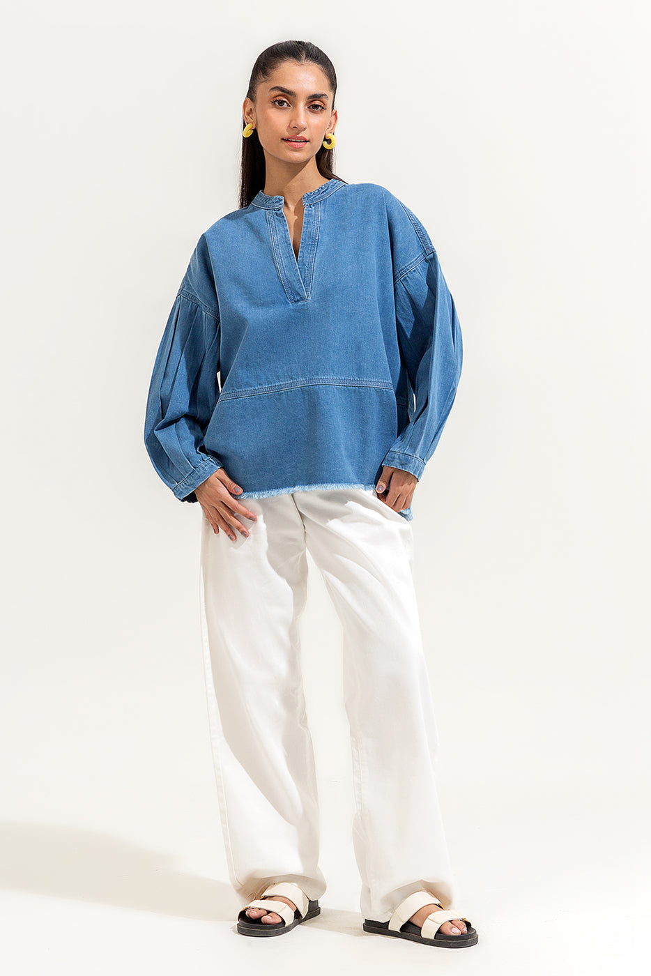 Cropped boxy fit top with drop shoulders, pleats detail on sleeves, cut and sew panel on front and back along with V neck with a band collar.