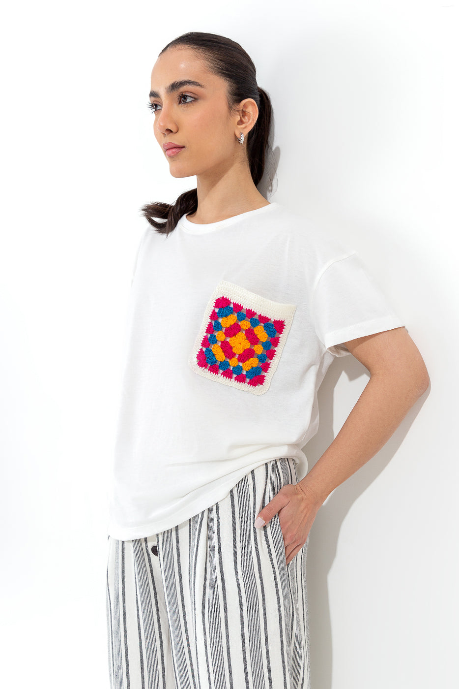 - Description: Boxy Tee With Drop Shoulders And Colorfull Crochet Pocket Detail.