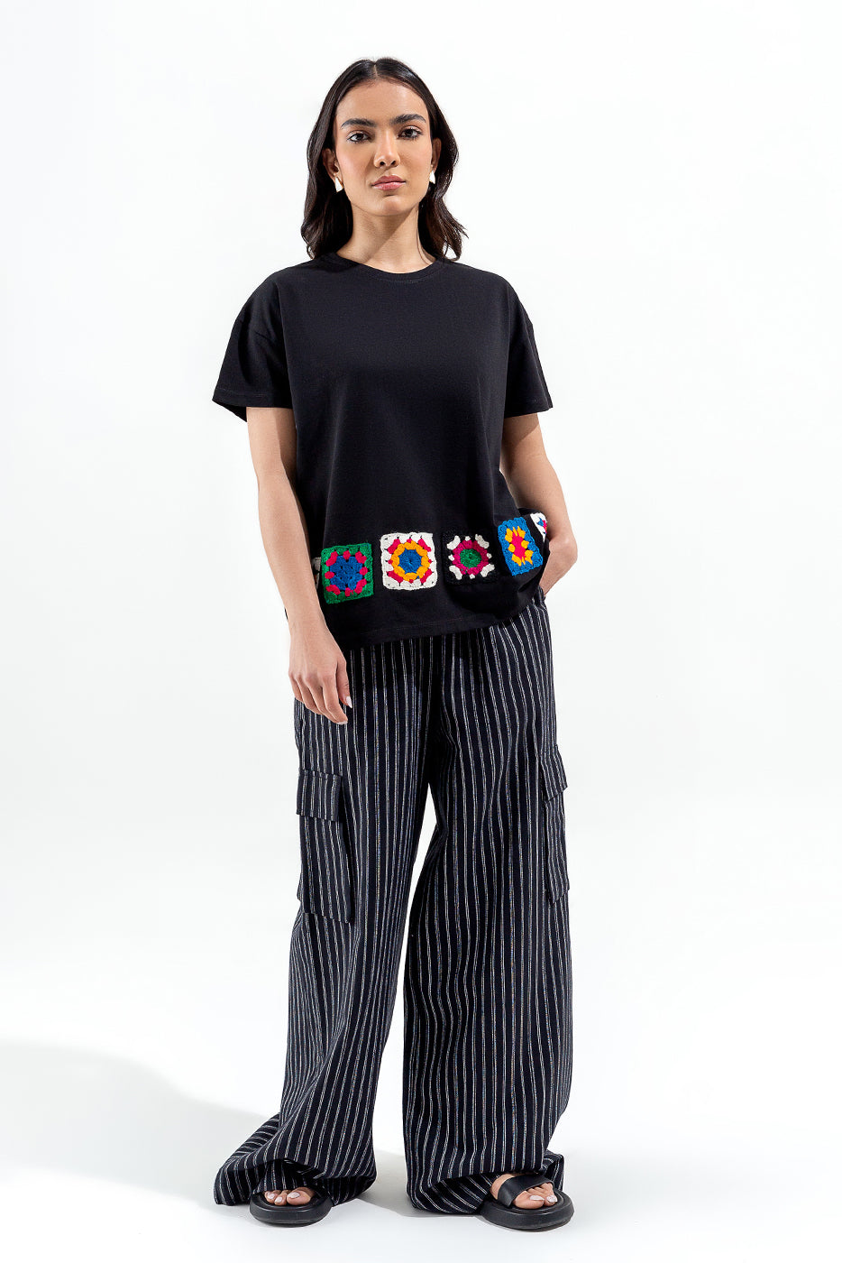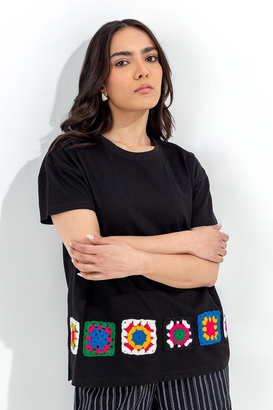 - Description: Black Boxy Tee With Drop Shoulders And Colorfull 3D Crochet Square Blocks Patched Above Hem.