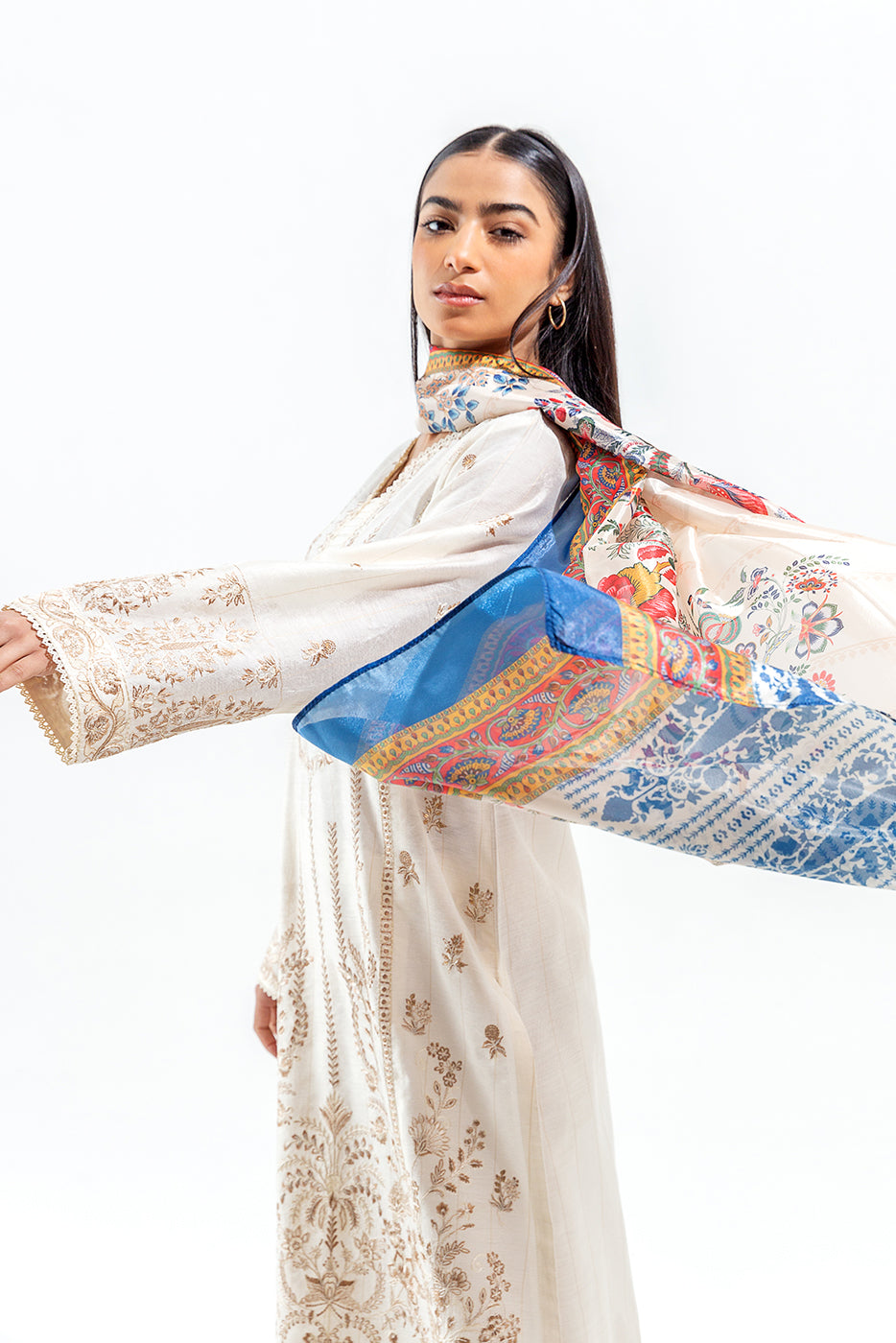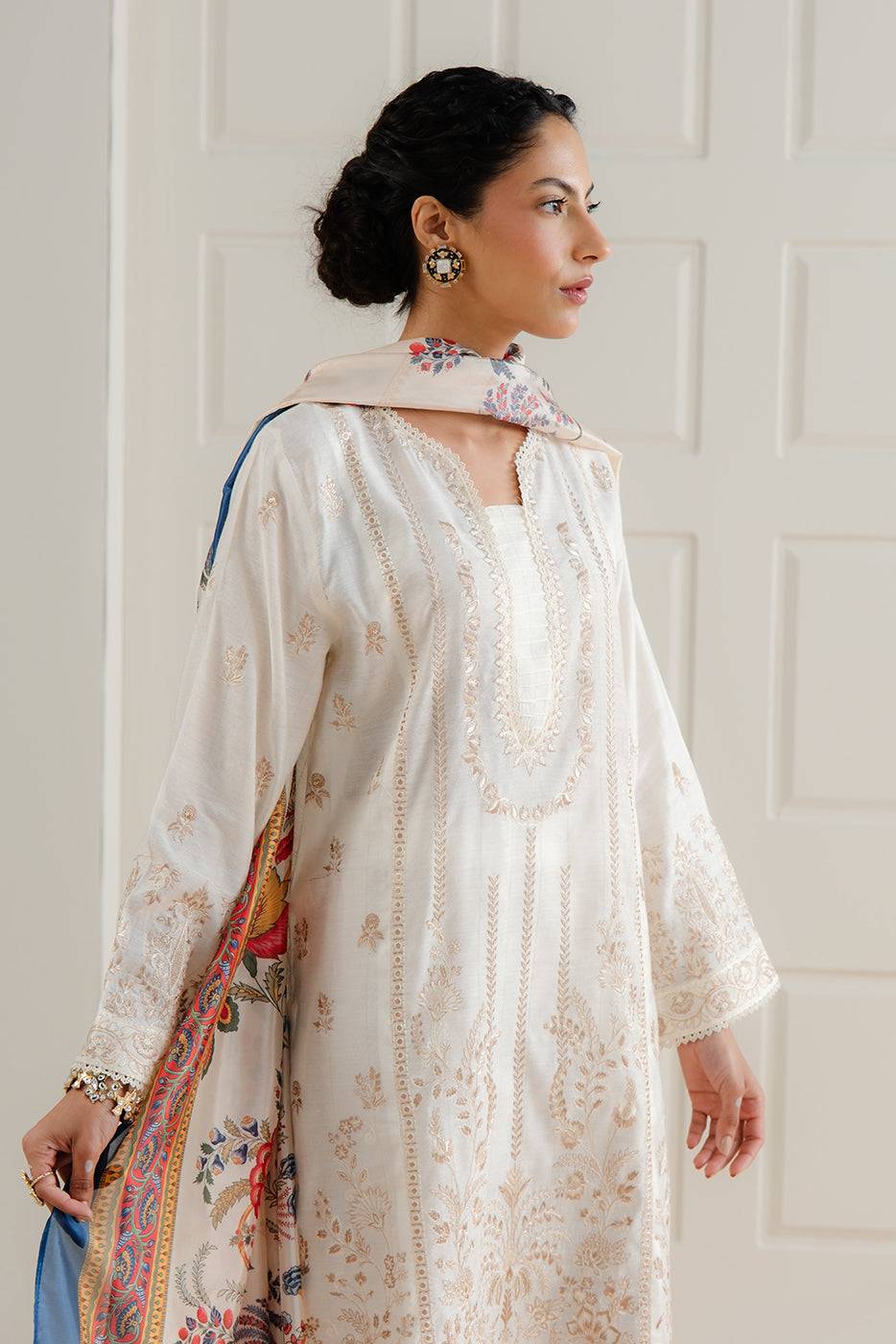 - Description: All Over Embroidered Shirt With Round Neckline With Pintucks And Lace Insert, Paired With Straight Pants And Printed Silk Dupatta To Complete The Look.